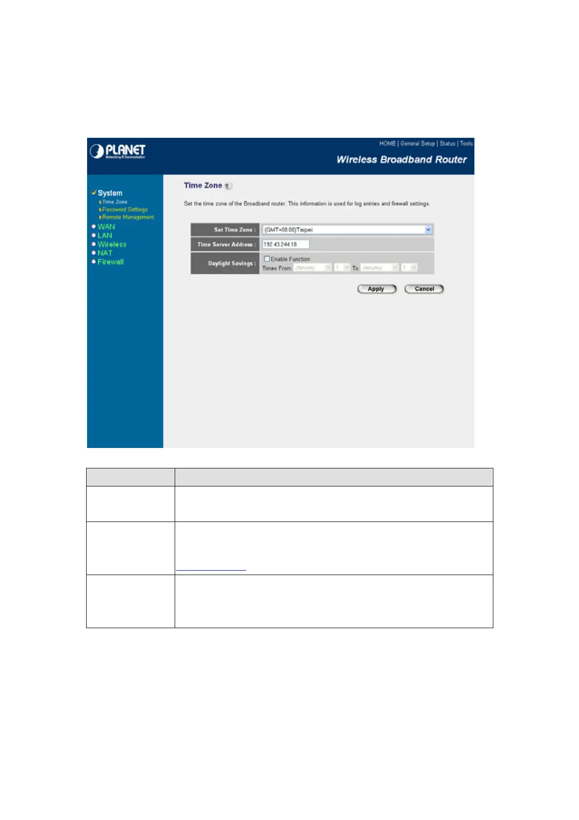 The Time Zone allows WRT-414 to allocate its time on the settings configured here, it will affect log