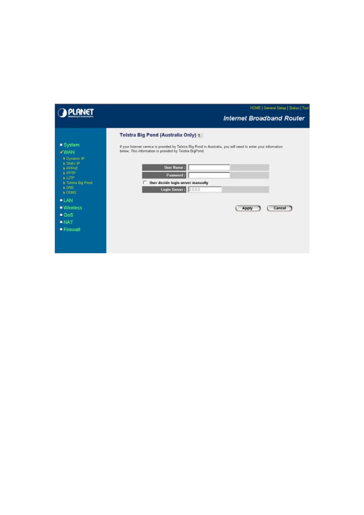 Select Telstra Big Pond if your ISP requires the Telstra Big Pond protocol to connect you to the Internet.