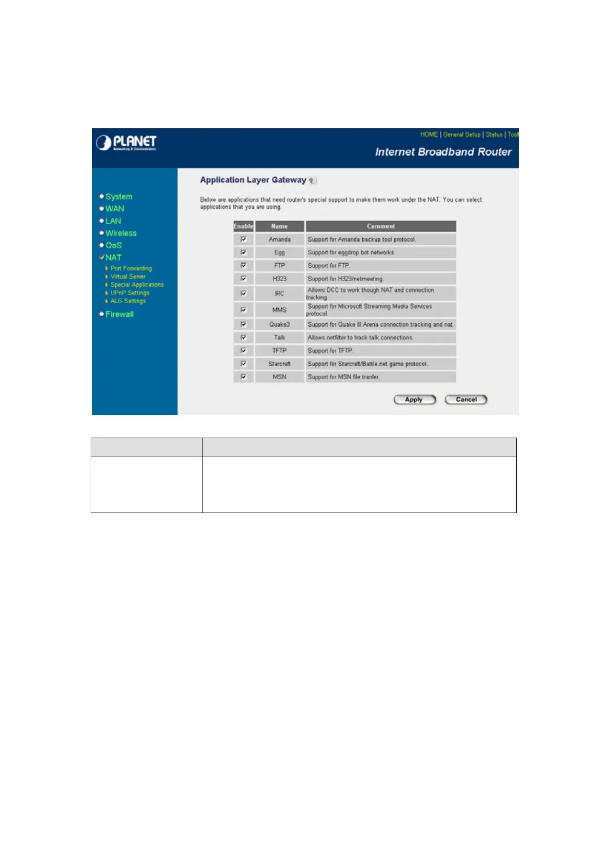 Enable You can select to enable “Application Layer Gateway” of an application and