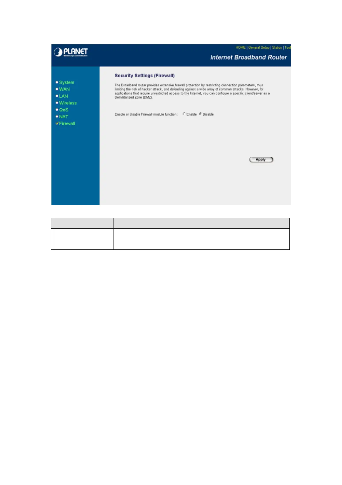 Enable/Disable You can select to enable or disable the firewall function. After selected,