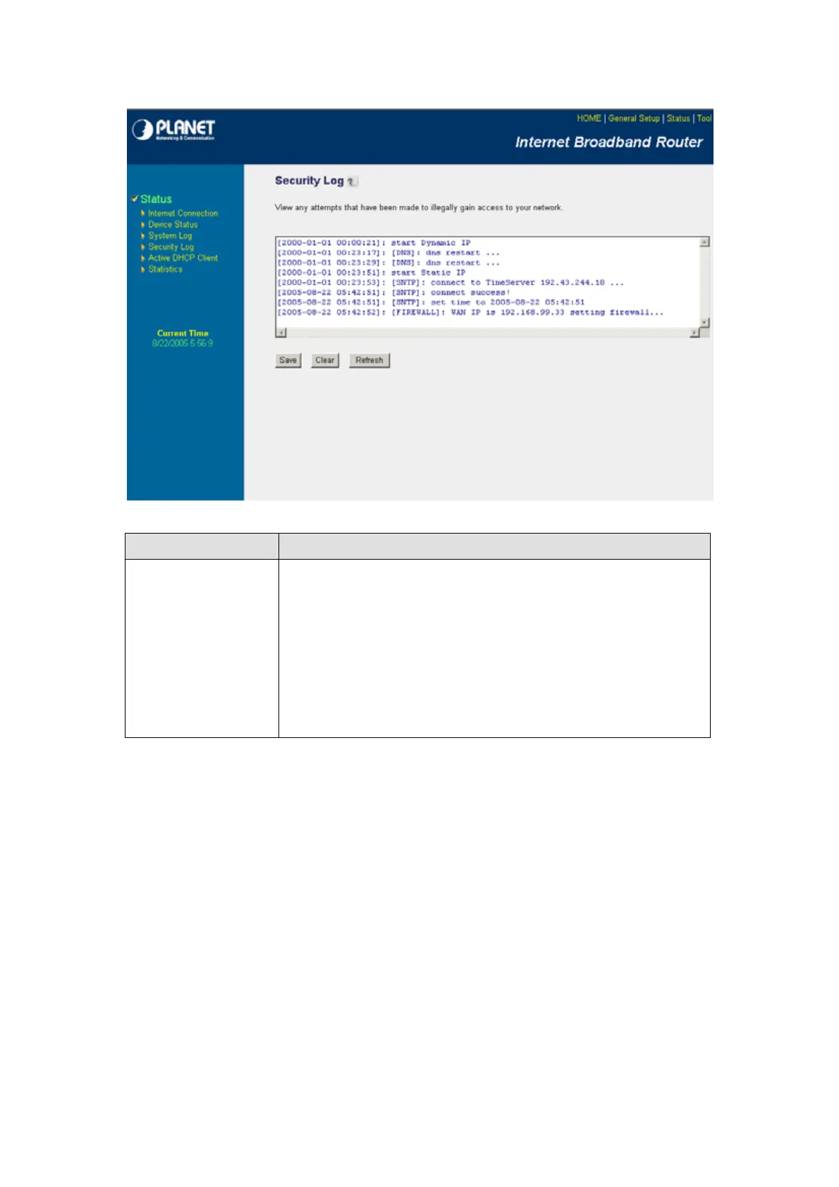 Security Log This page shows the current security log of WRT-414. It displays any illegal