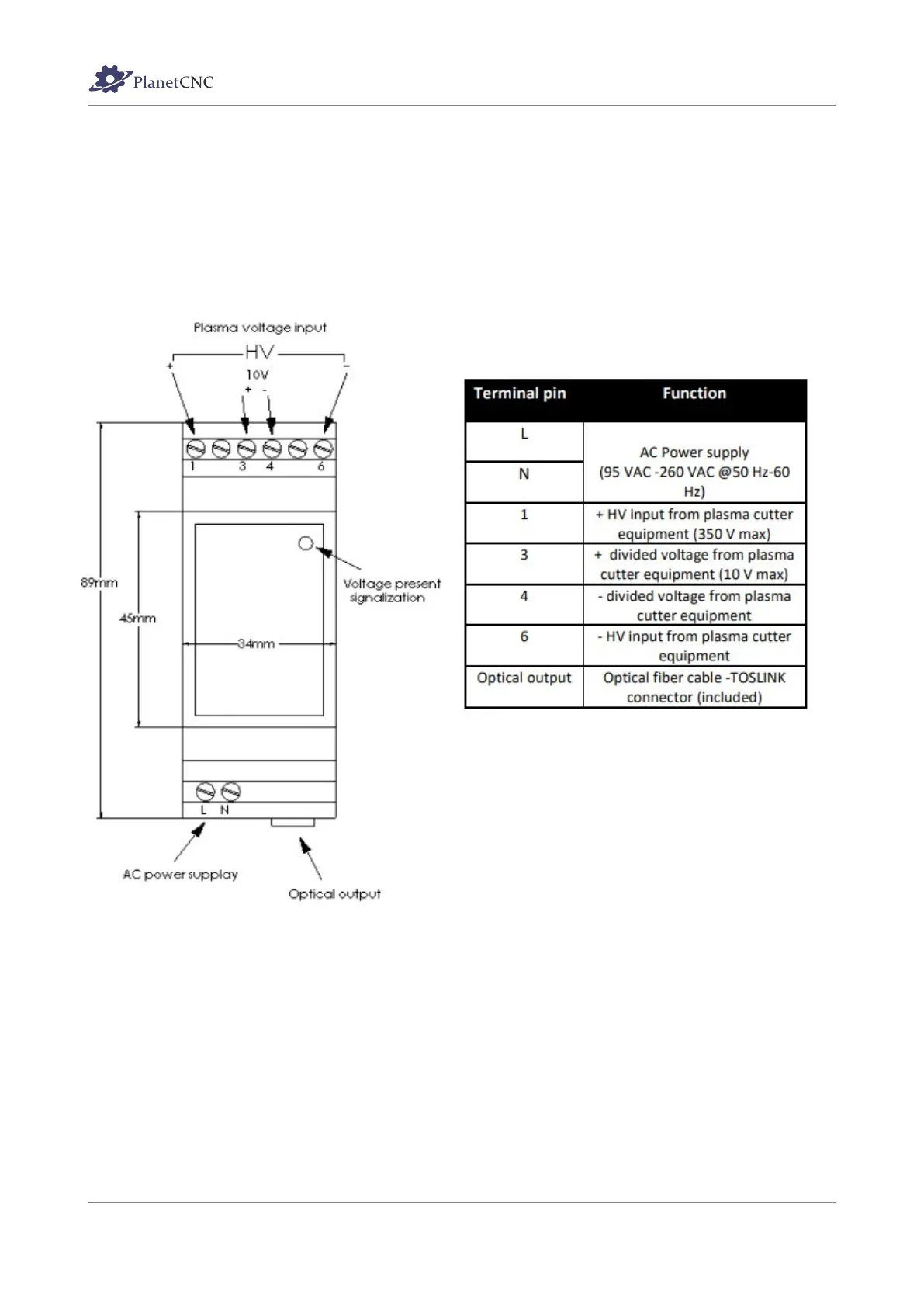 PlanetCNC THC - Torch Height Sensor Terminal Description