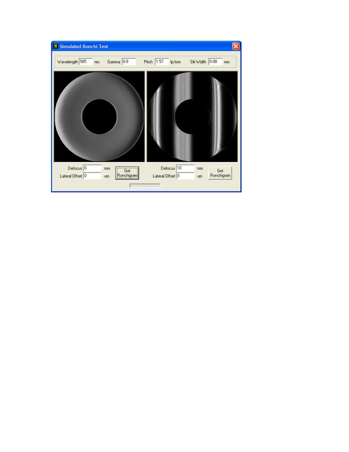 image is a simulation of what an out of focus view looks like through a Ronchi screen. The right image