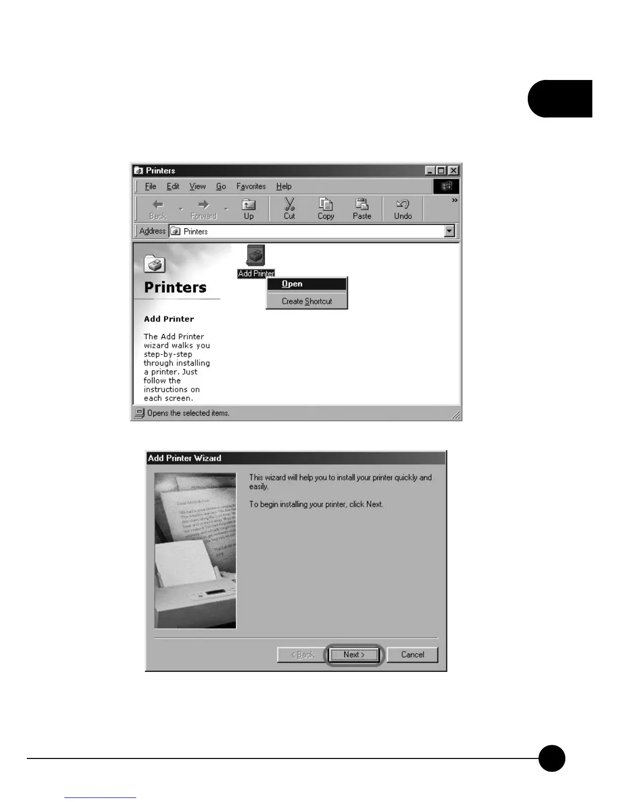 and then the Add Printer Wizard window will pop up. ClickņNextŇto