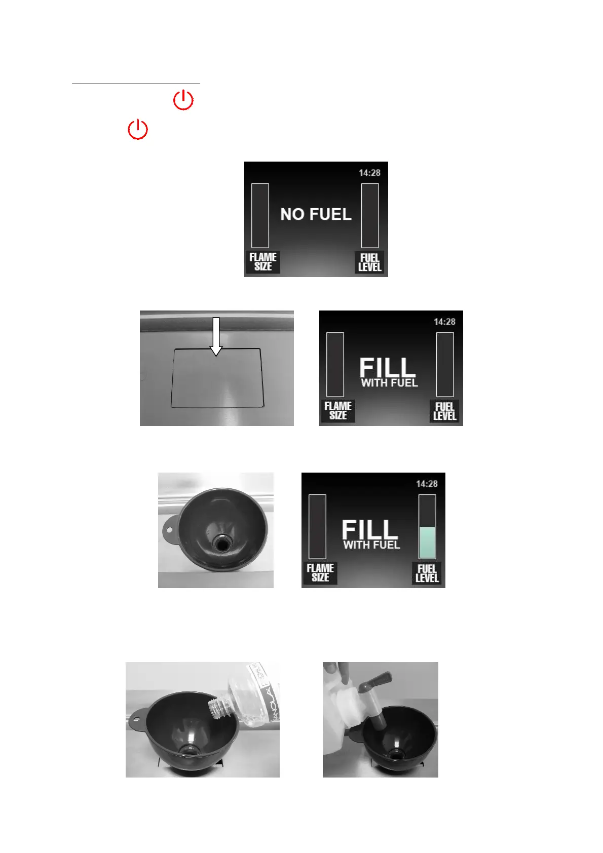 3b. Insert the funnel and fill the reservoir with fuel. Fuel level indicator on the display will
