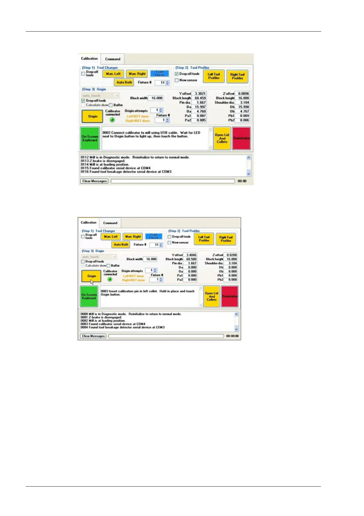 9. The following message will appear in the first text box: "Insert calibration pin in the