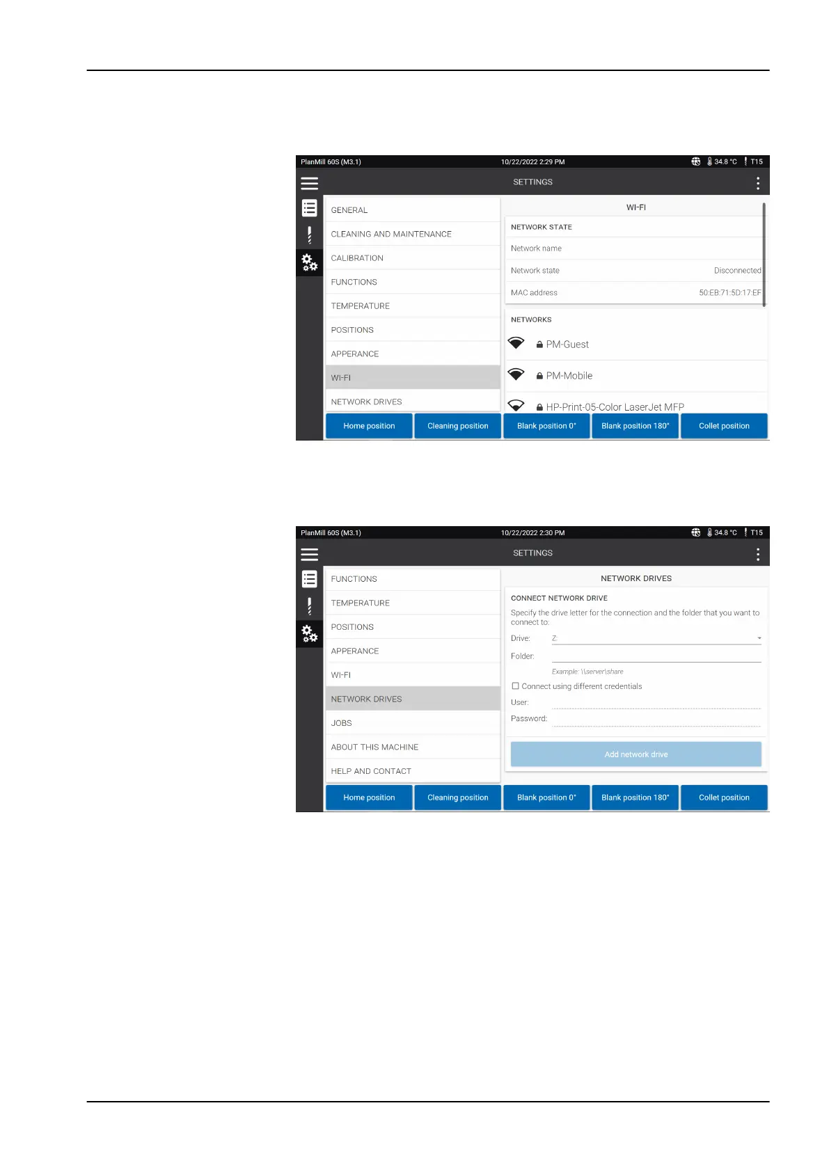 address of your milling unit. It also shows the available Wi-fi networks and