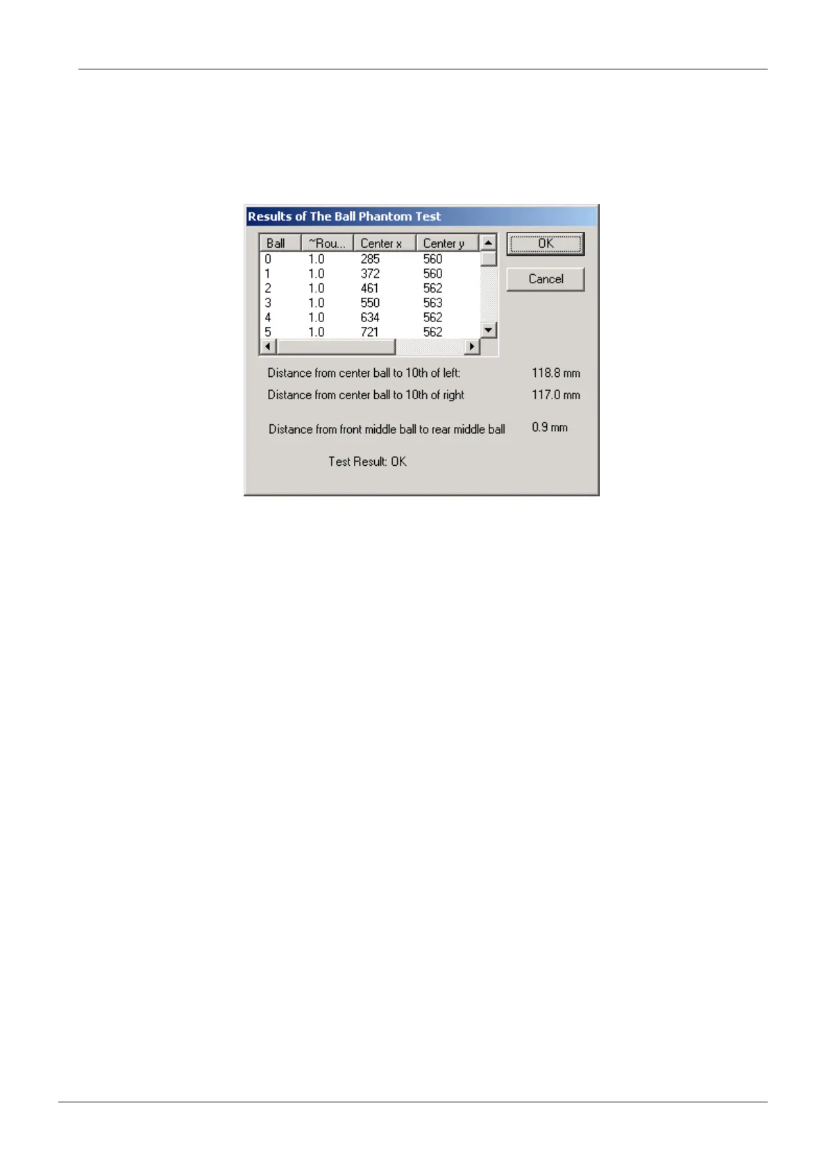 Also the Results of the ball phantom test window appears. In this window the distances from