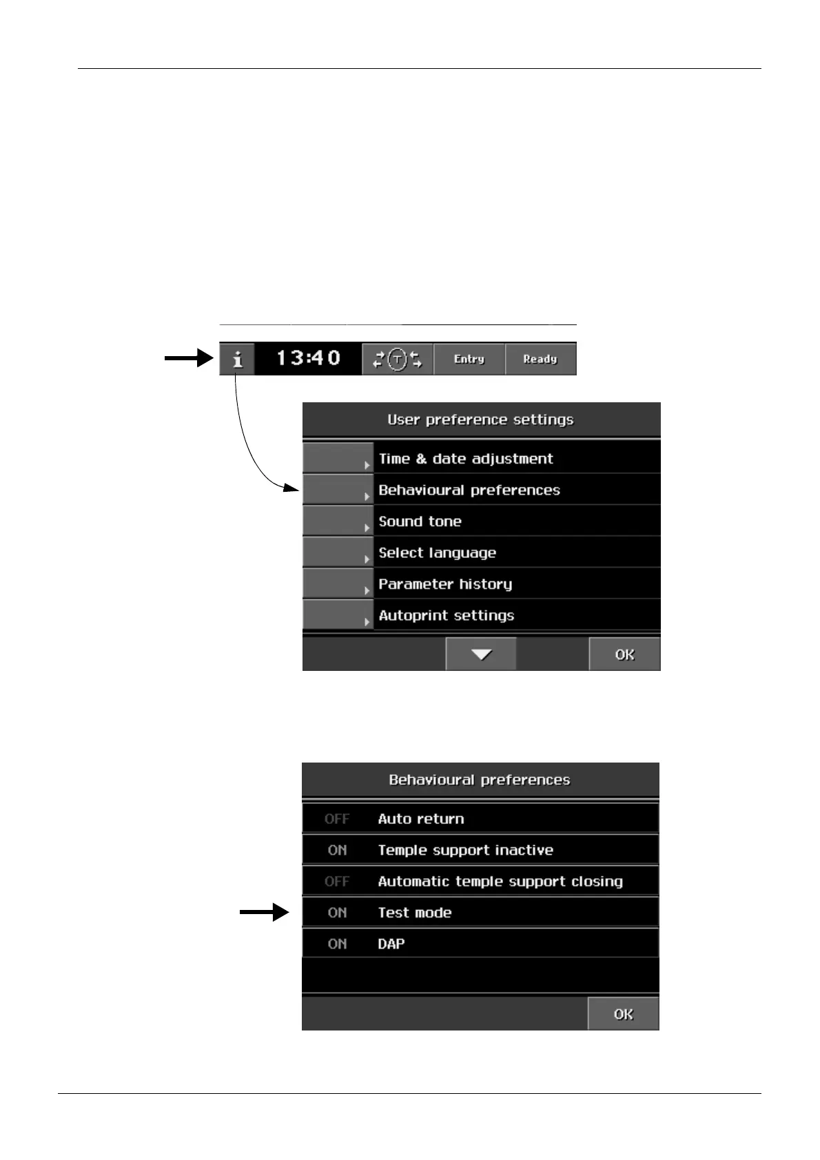 Select the Test mode as follows. Touch the i-field on the