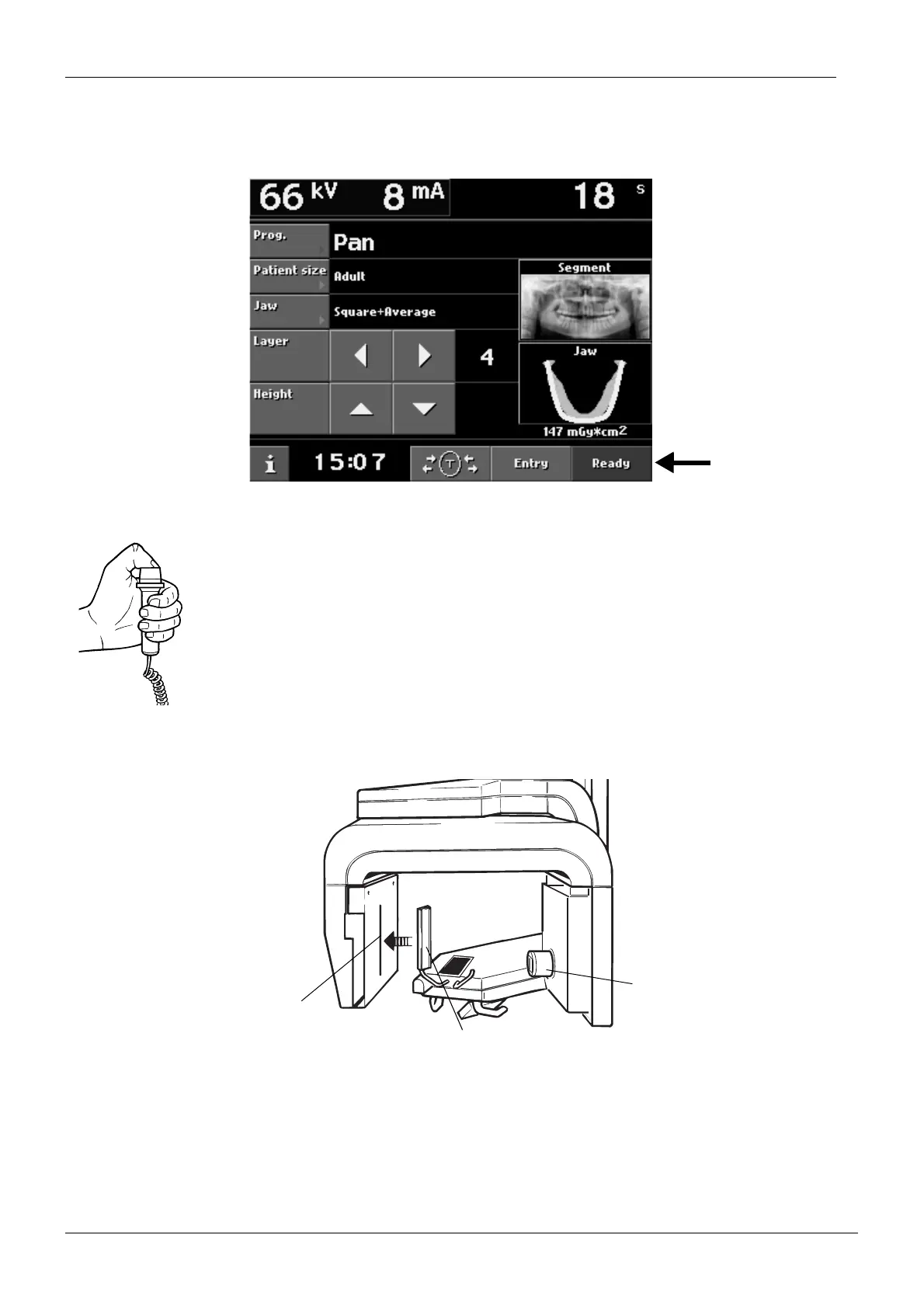 Touch the Ready field to drive the X-ray unit into the exposure position. The rotating unit and