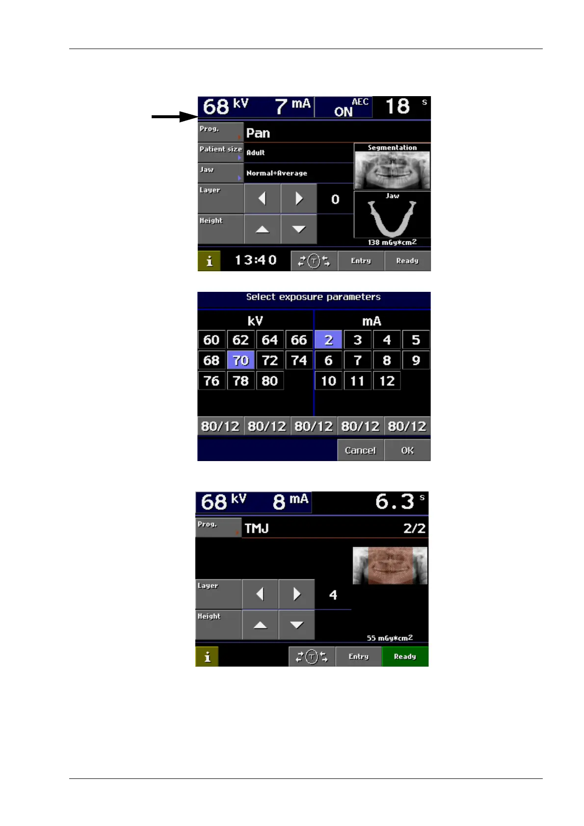 7.2.1 Selecting kilovolt/milliampere values and jaw size