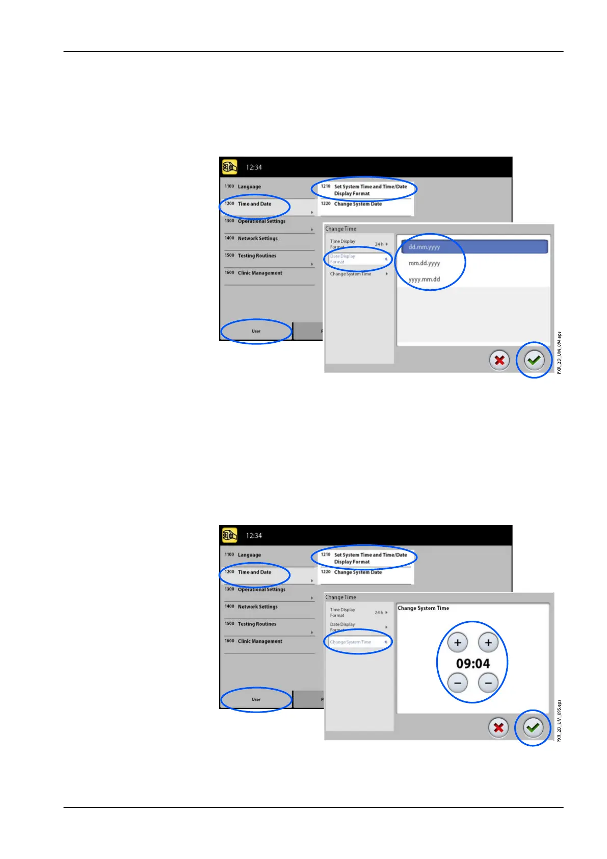 1. Select User > 1200 Time and Date > 1210 Set System Time and Time /