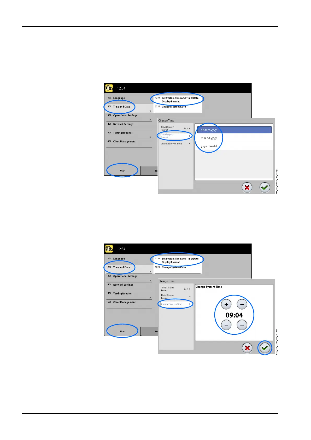 1. Select User > 1200 Time and Date > 1210 Set System Time and Time /