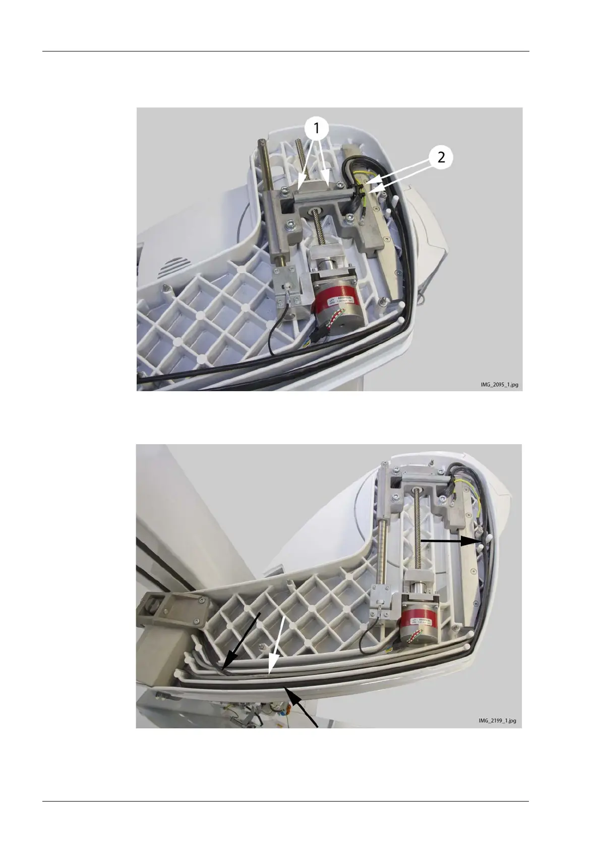16. Attach the upper arm cable guide (1). Secure the PSU CAN and C-arm camera cable