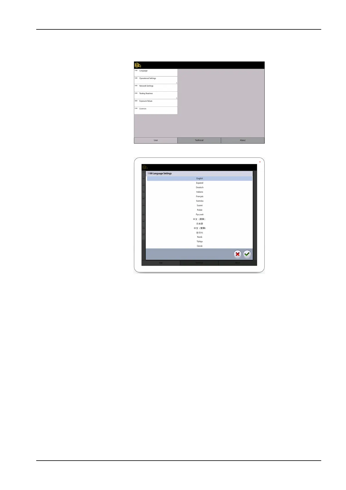 1. Select User > 1100 Language.