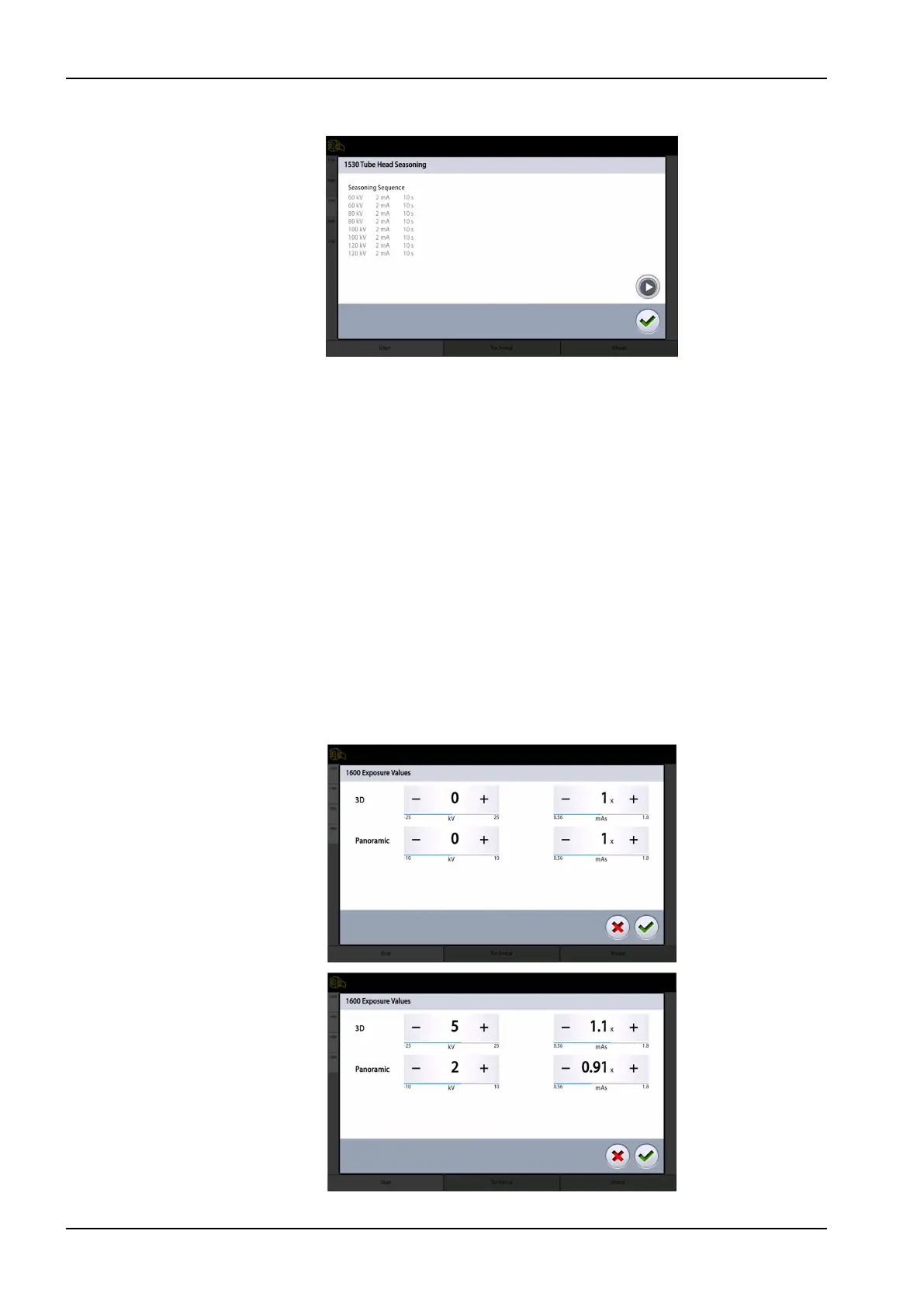1. Go to 1600 Exposure Values to check the default kV and mA settings for