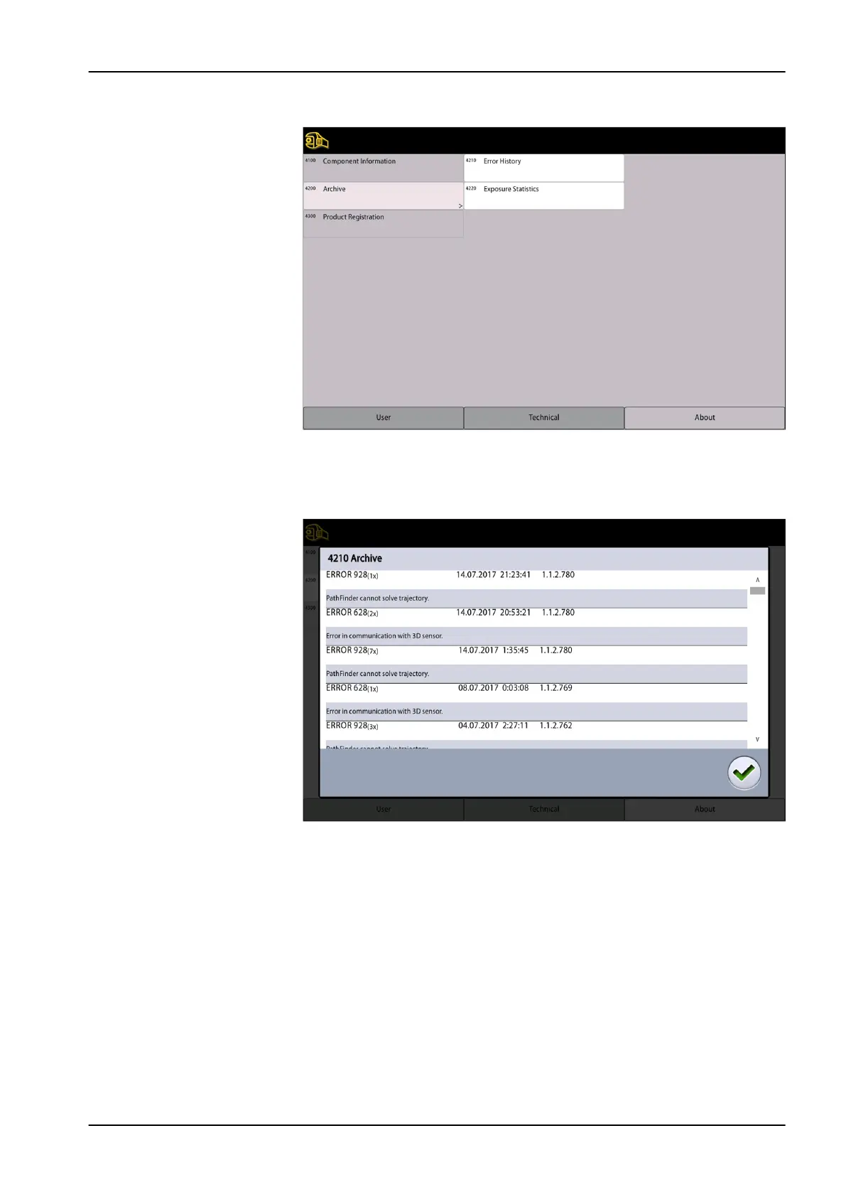Select About > 4200 Archive > 4210 Error History to view a list of the error