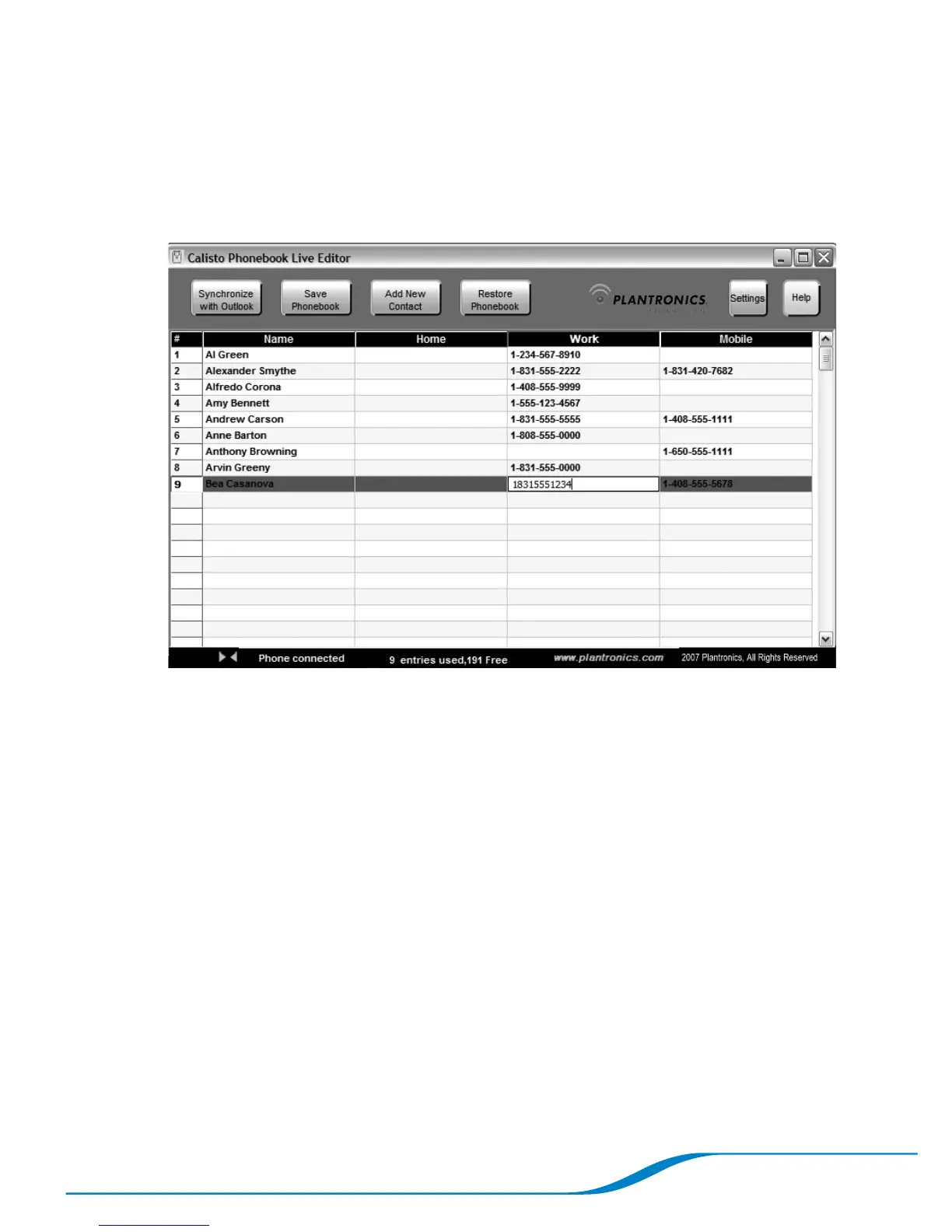 On the Plantronics Phonebook Editor screen, click inside the cell