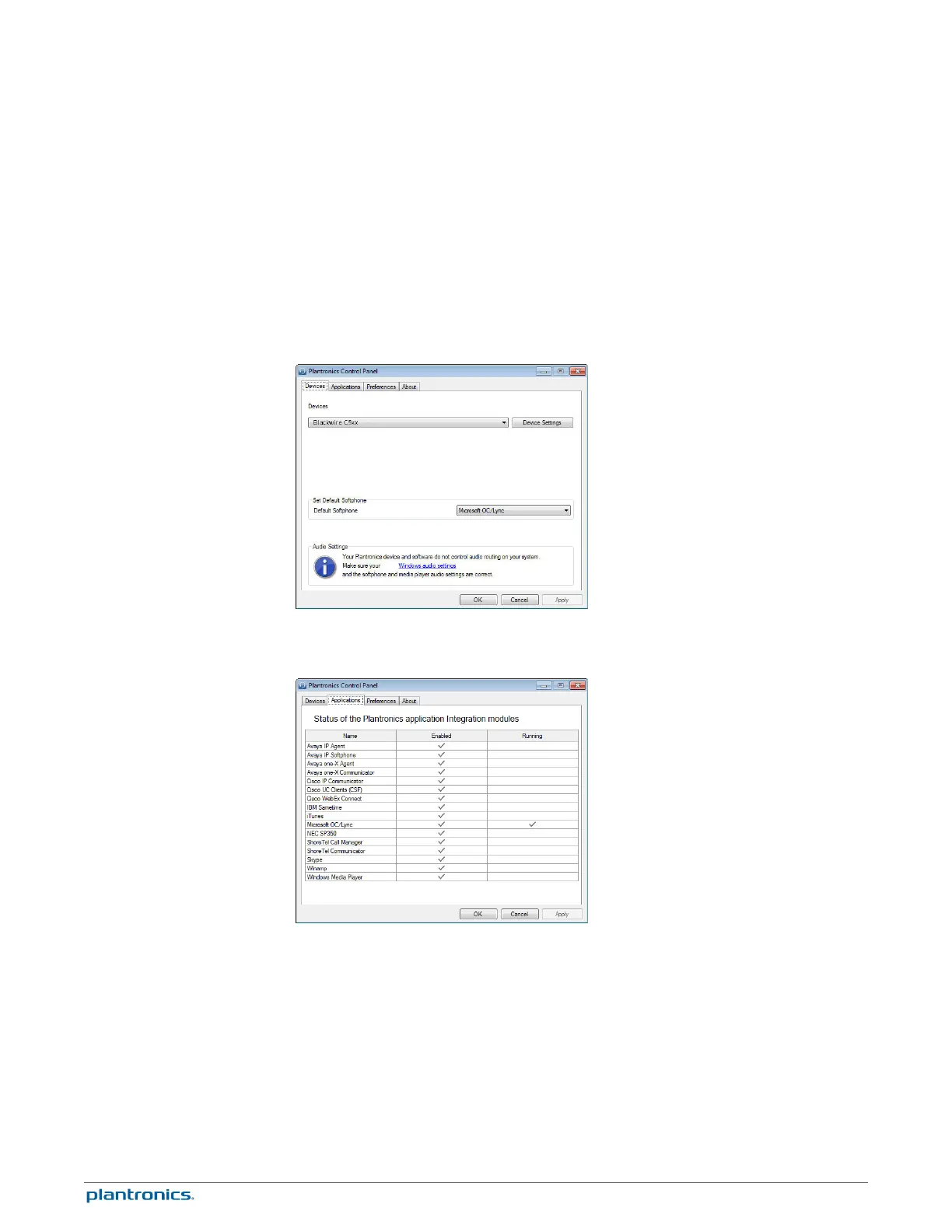 The Applications tab displays the status of Plantronics support for various applications such as