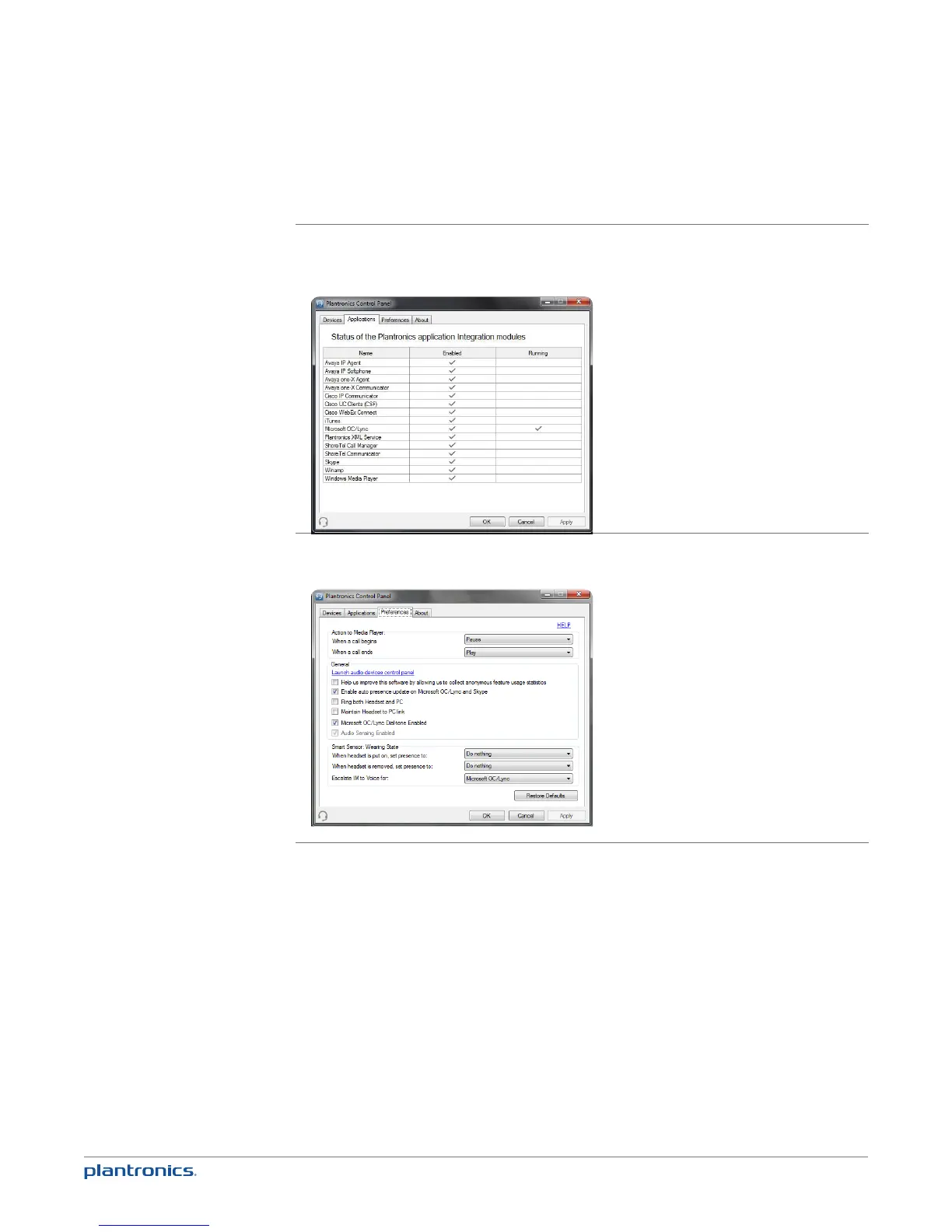 Displays the status of Plantronics support for various applications such as softphones and media players
