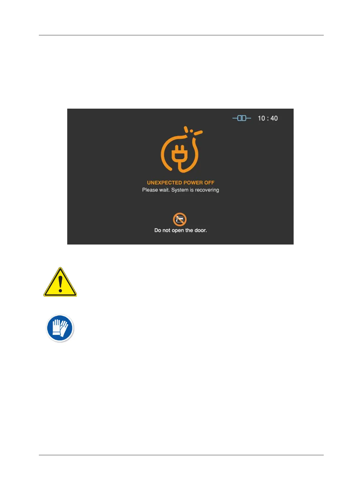 If the power of sterilization system is abnormally shut off during the sterilization process, the following