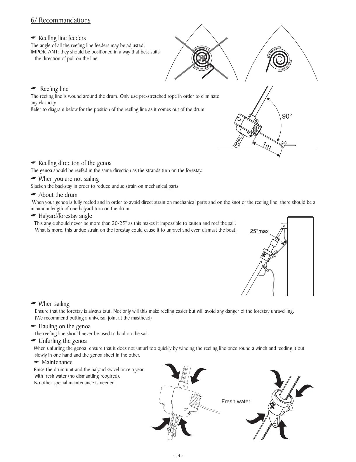 Ensure that the forestay is always taut. Not only will this make reefing easier but will avoid any danger of the forestay unravelling.