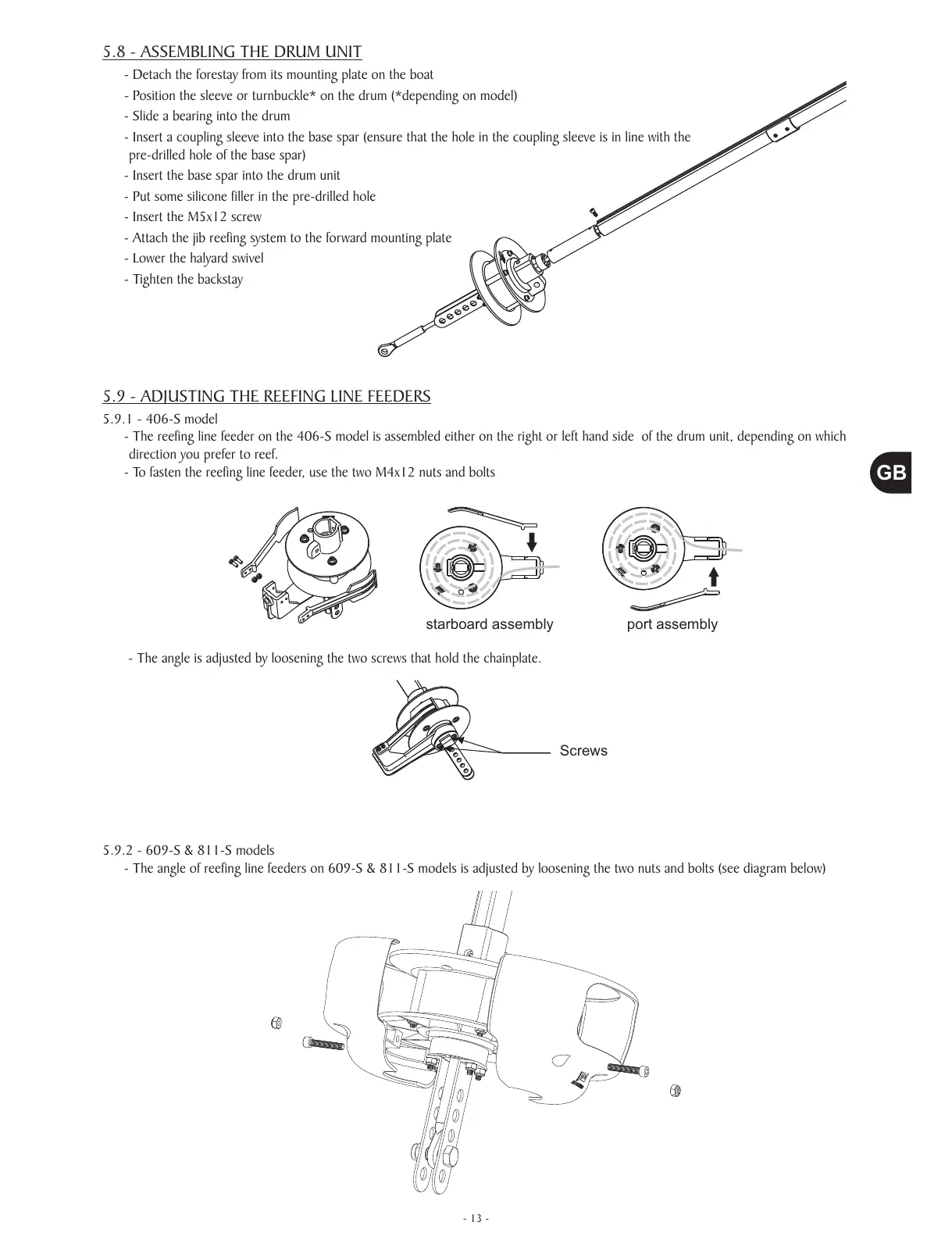- The angle of reefing line feeders on 609-S & 811-S models is adjusted by loosening the two nuts and bolts (see diagram below)