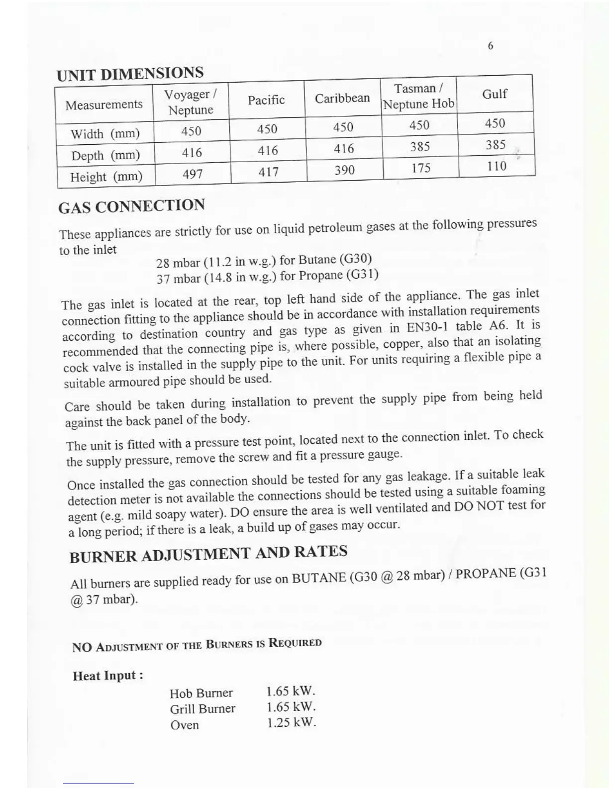 Plastimo Neptune 2500 - UNIT DIMENSIONS; GAS CONNECTION; BURNER ADJUSTMENT AND RATES