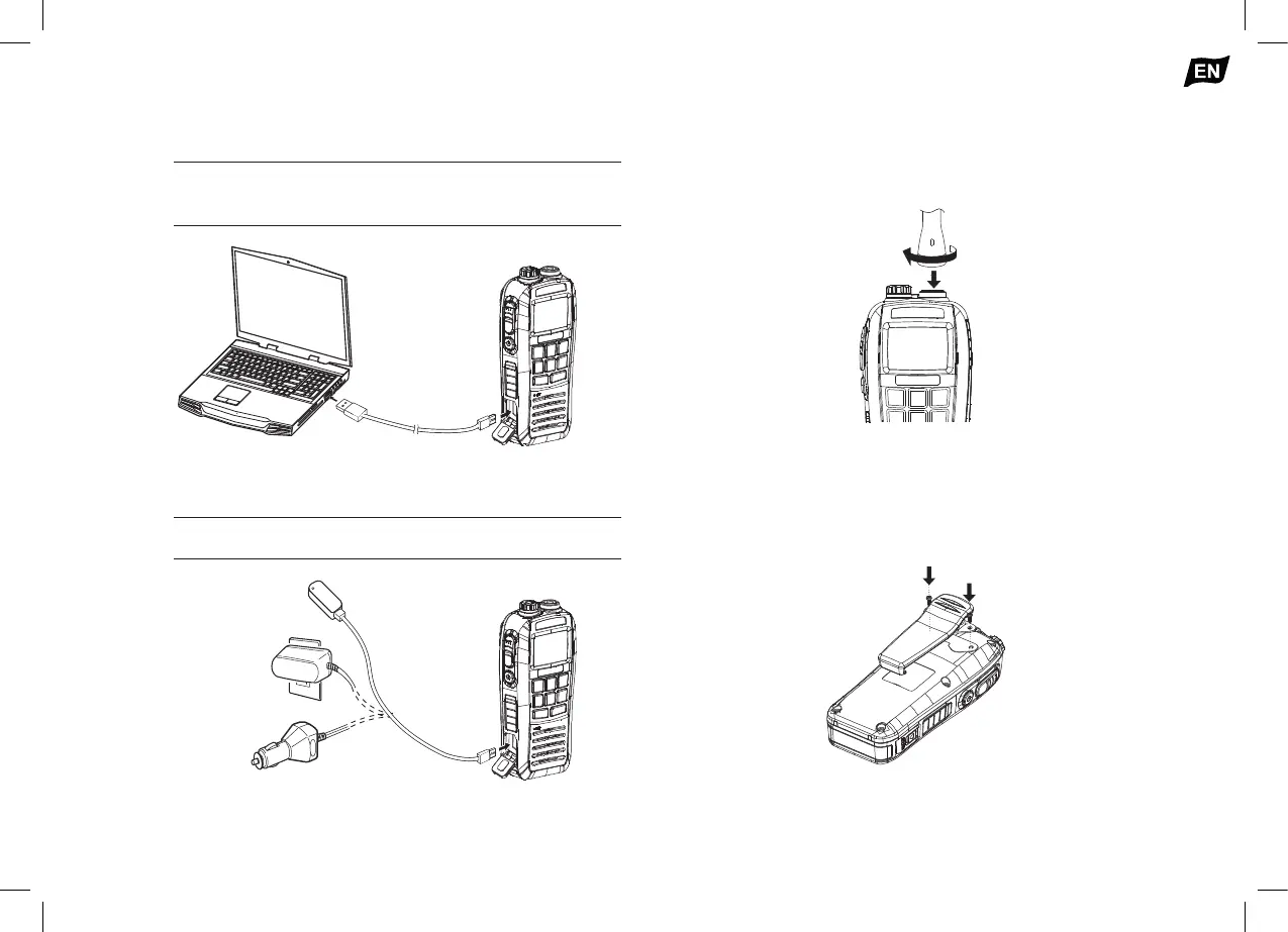 2. Open the radio charging port cover. Connect the adaptor