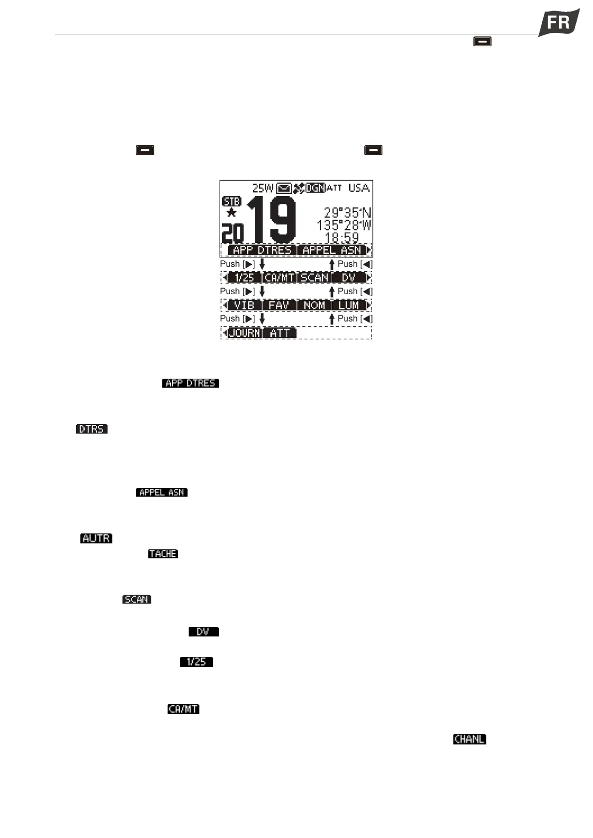 Appuyez pour afficher l’écran « DISTRESS », pour sélectionner la nature de la détresse, puis pour passer