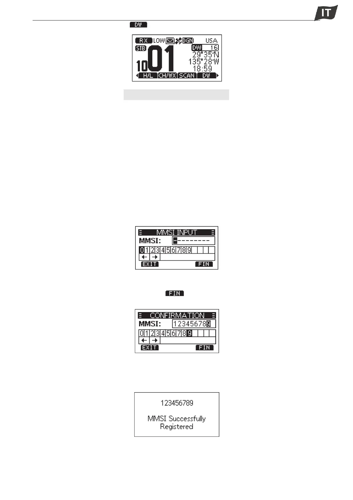 ·Quando il codice MMSI viene inserito correttamente, “MMSI Successfully Registered” viene