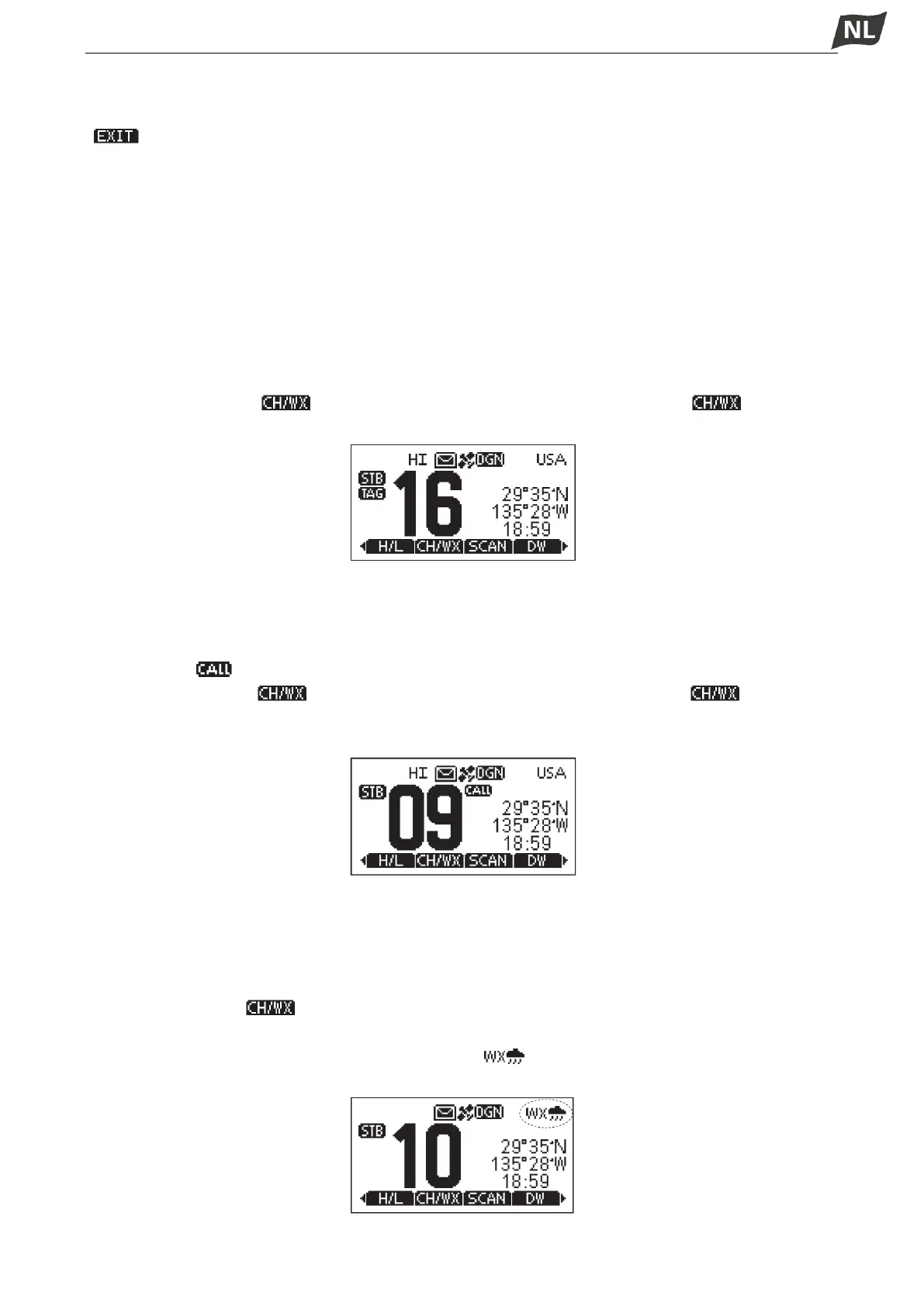 ●Als WX-waarschuwing op AAN is ingesteld, wordt ‘ ’ weergegeven in plaats van ‘WX’.