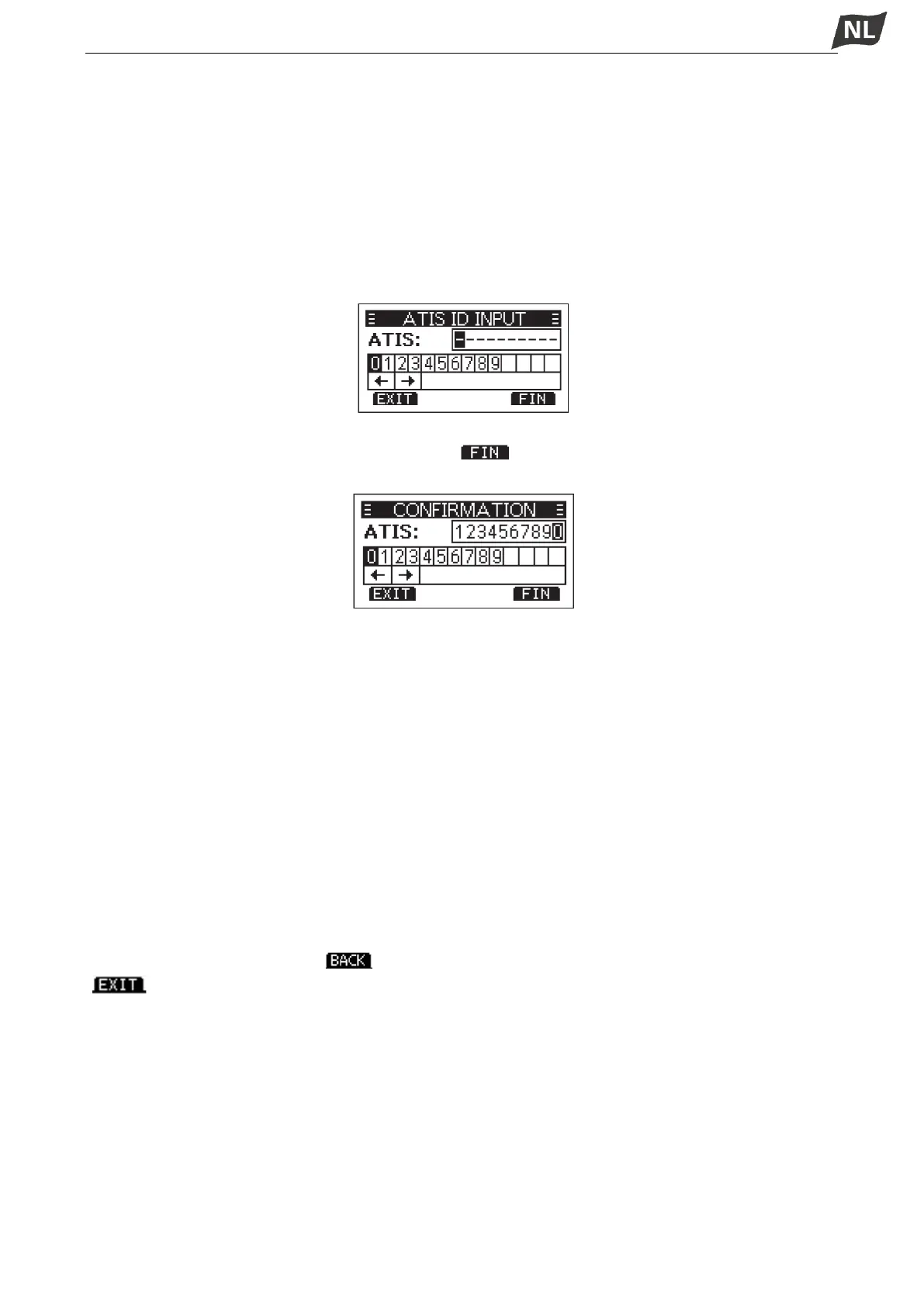 bestaat uit 10 cijfers. U kunt de ATIS-id in het item ‘ATIS ID Input’ in het menuscherm invoeren.