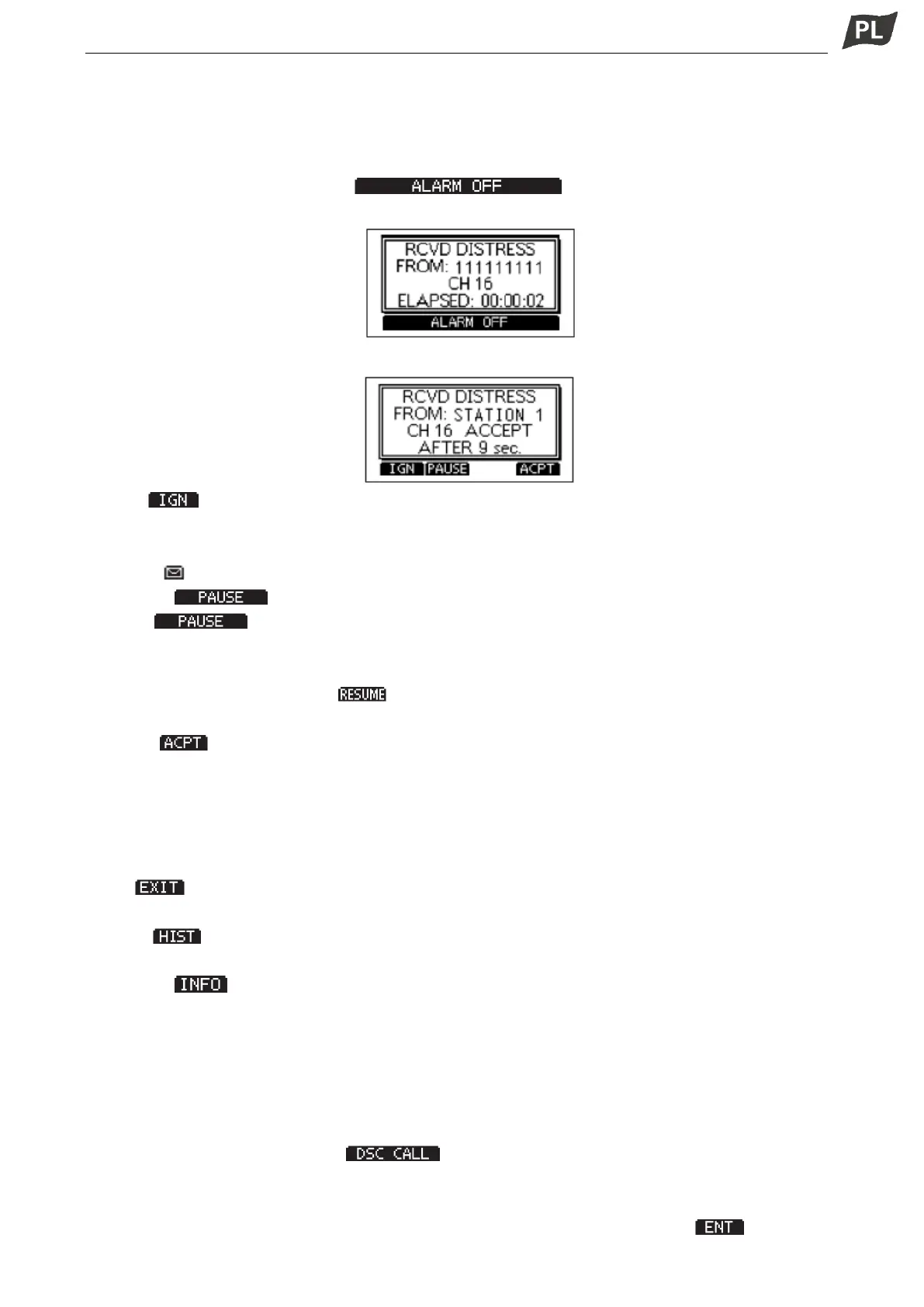 • Wywietlany jest komunikat „RCVD DISTRESS”, a podświetlenie wyświetlacza mruga.