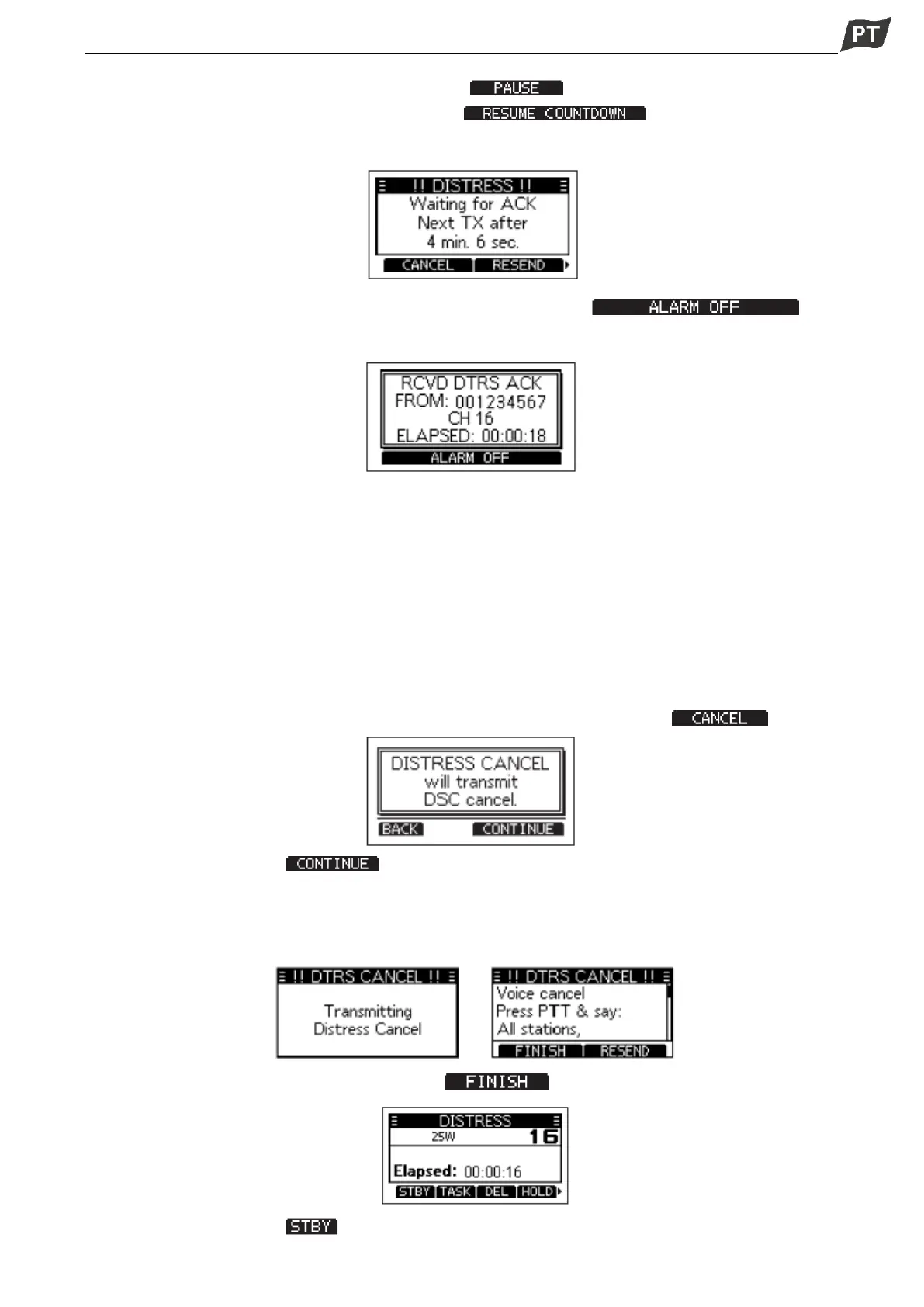 para reenviar a próxima chamada de socorro, prima [ ] para retomar a contagem