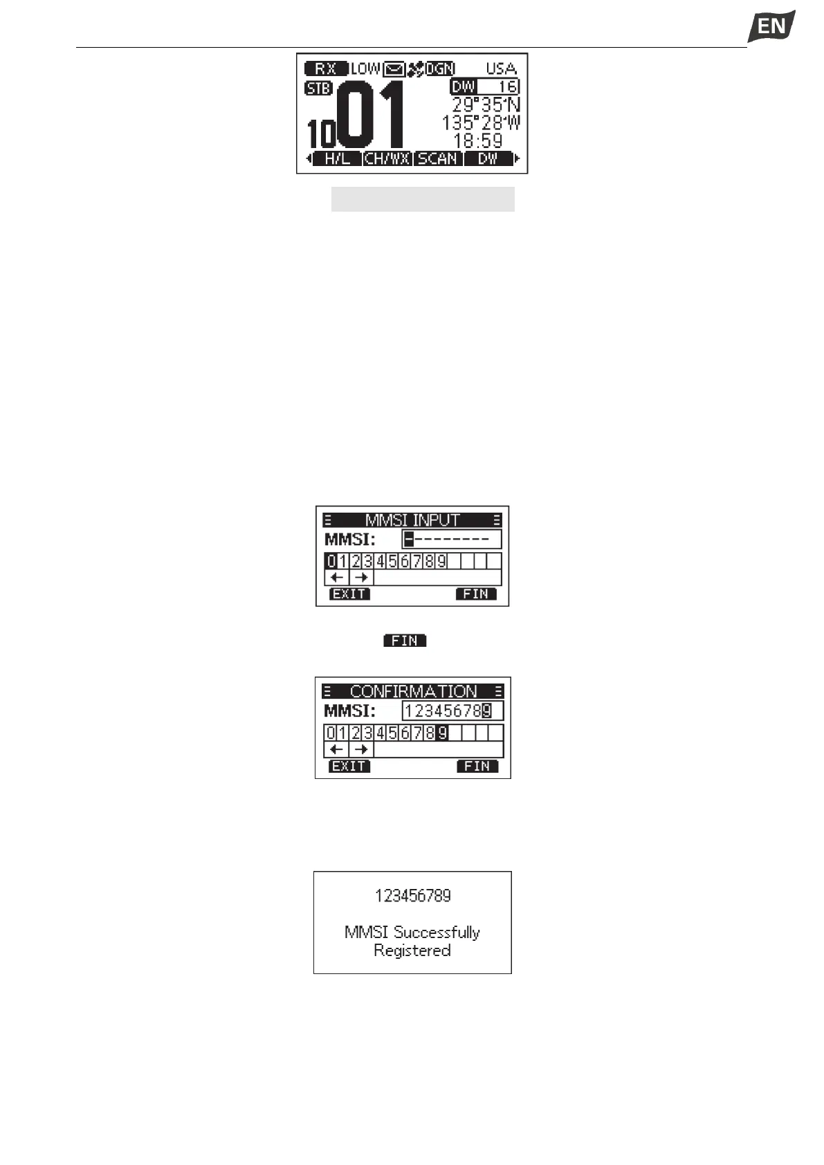 ·When your MMSI code is successfully input, “MMSI Successfully Registered” is displayed as