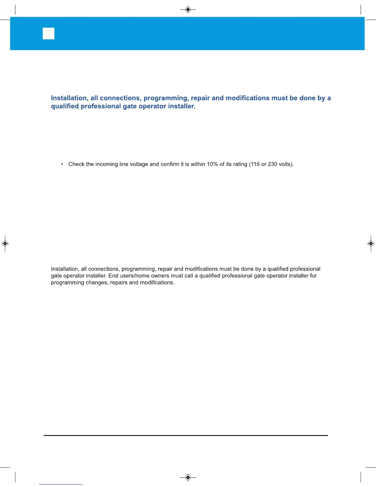 • Keep spraying water hoses and sprinkler systems away from the gate, gate operator and the
