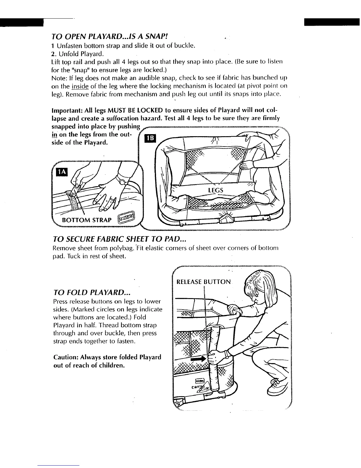 Playskool Carry Lite Playard - Product Operations; Opening the Playard; Securing Fabric Sheet; Folding the Playard