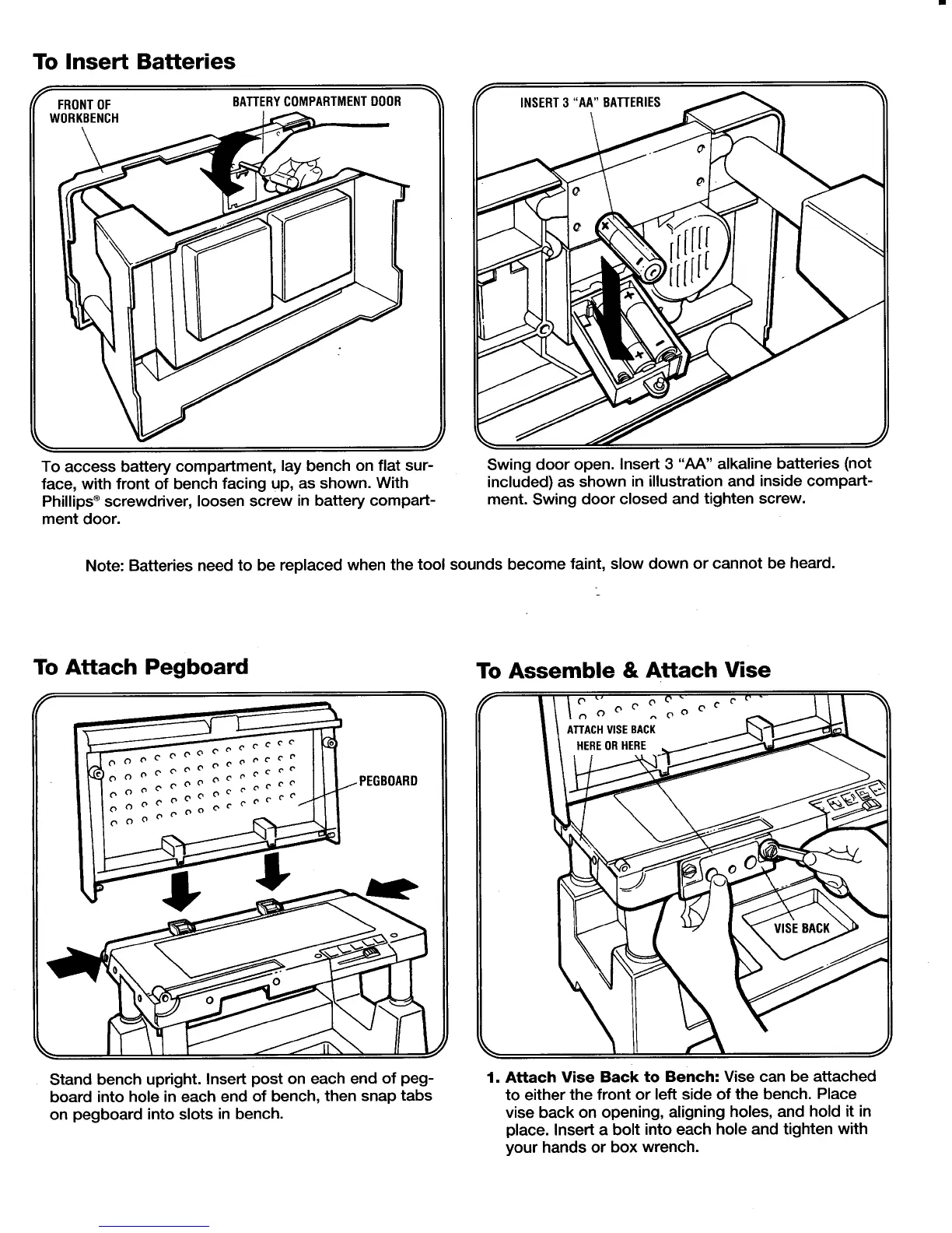 Playskool Power Workbench - Assembly and Setup Instructions; Inserting Batteries; Attaching the Pegboard; Assembling and Attaching the Vise