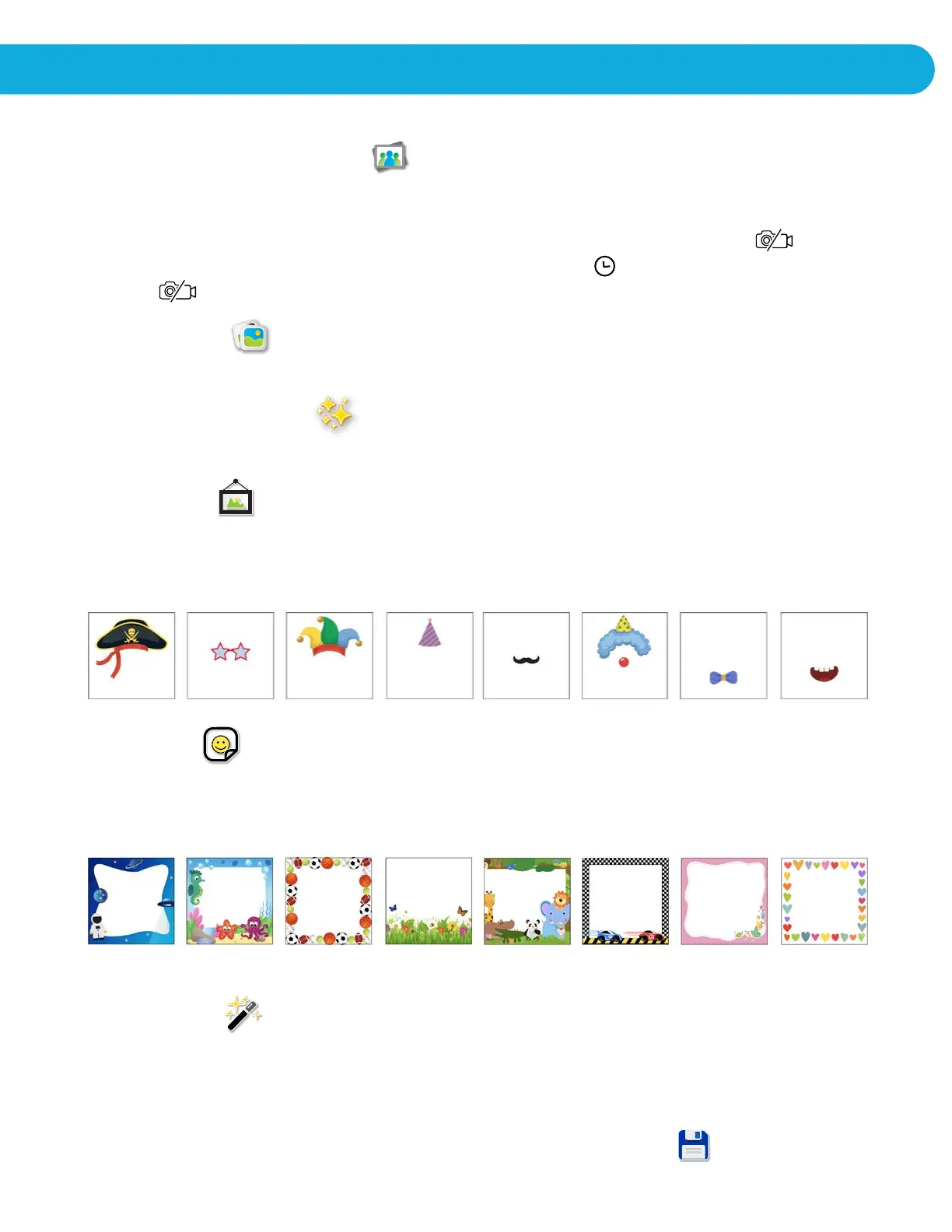Choose this icon to add fun photo frames, fun stickers and special effects.
