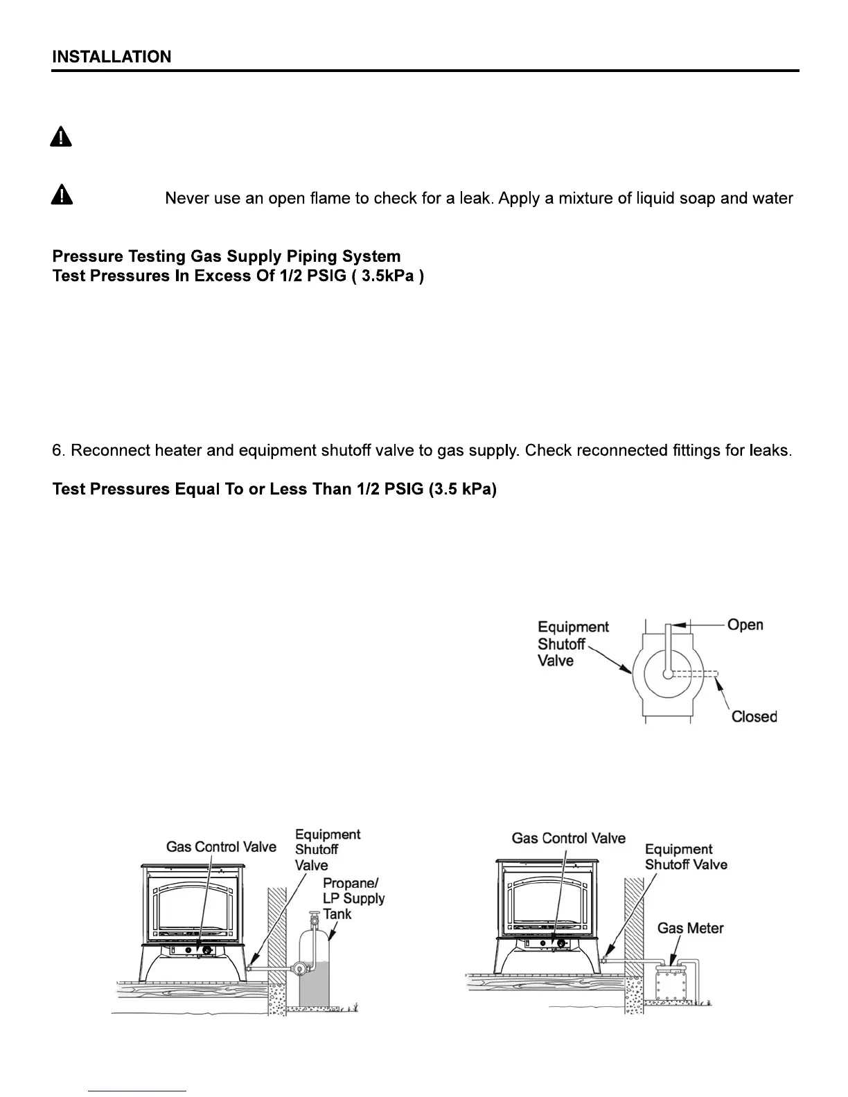 from gas supply piping system. Pressures in excess of 1/2 PSIG will damage heater regulator.