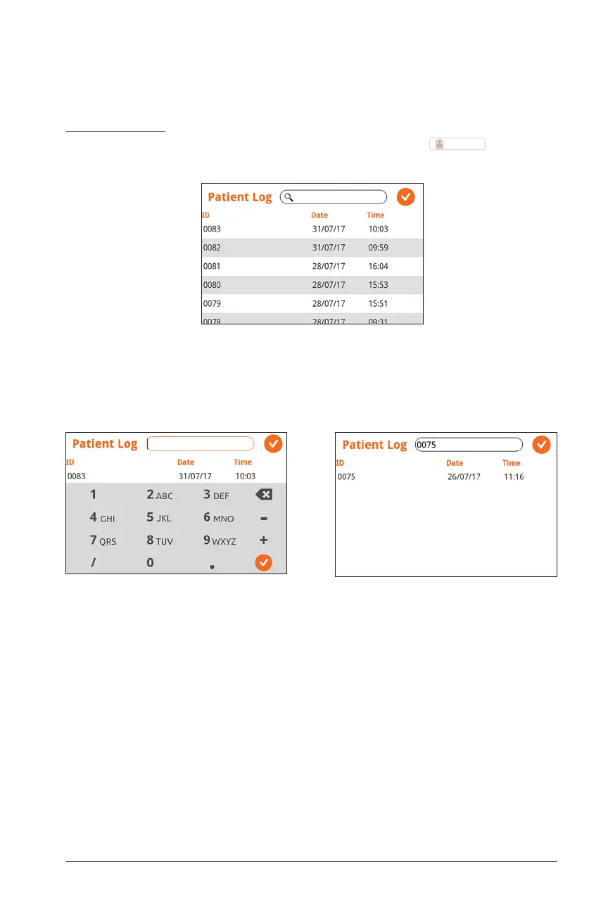 To access the log of all patient data stored on the device, select