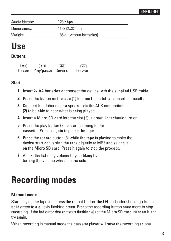 2. Press the button on the side (1) to open the hatch and insert a cassette.