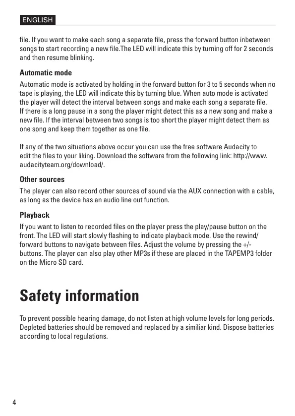tape is playing, the LED will indicate this by turning blue. When auto mode is activated