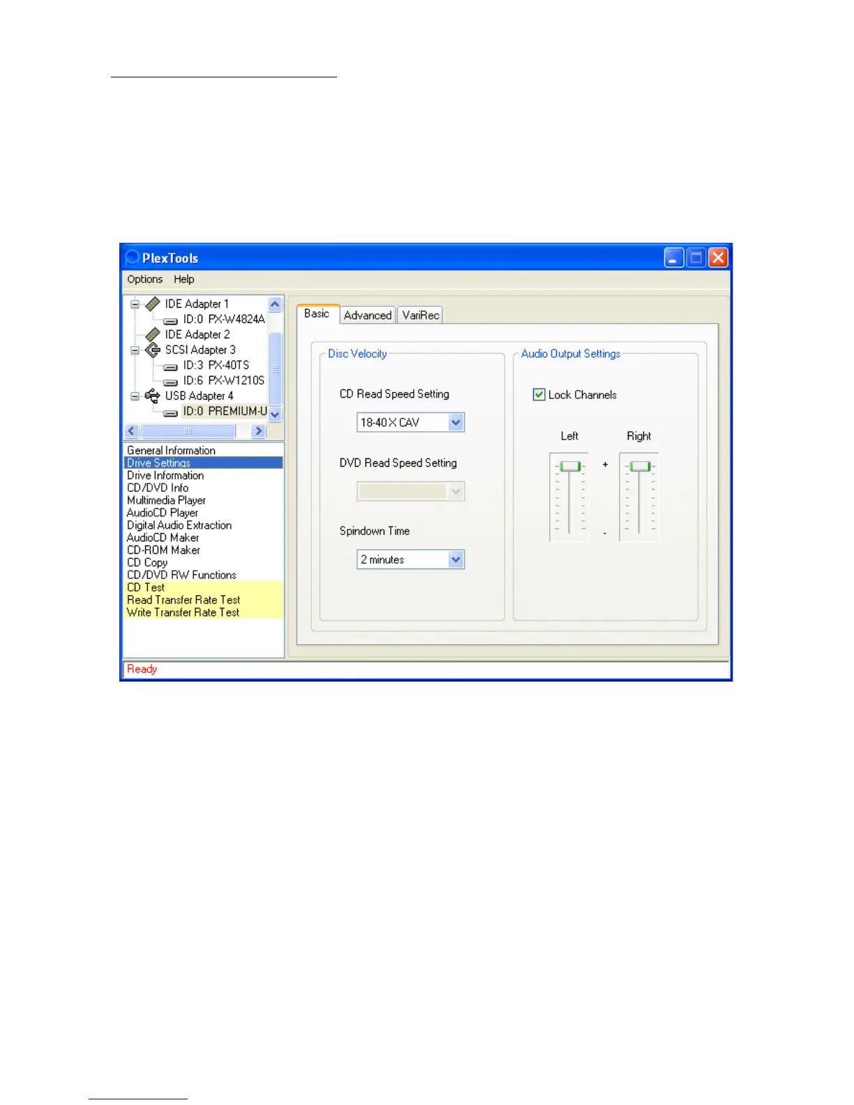 To change a drive's reading speed, spindown time or audio output settings, click on