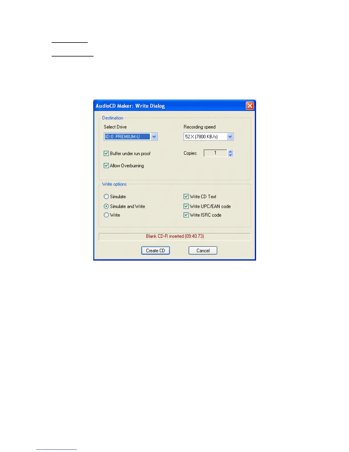 Other options allow the recording of CD TEXT, UPC/EAN and ISRC code on the