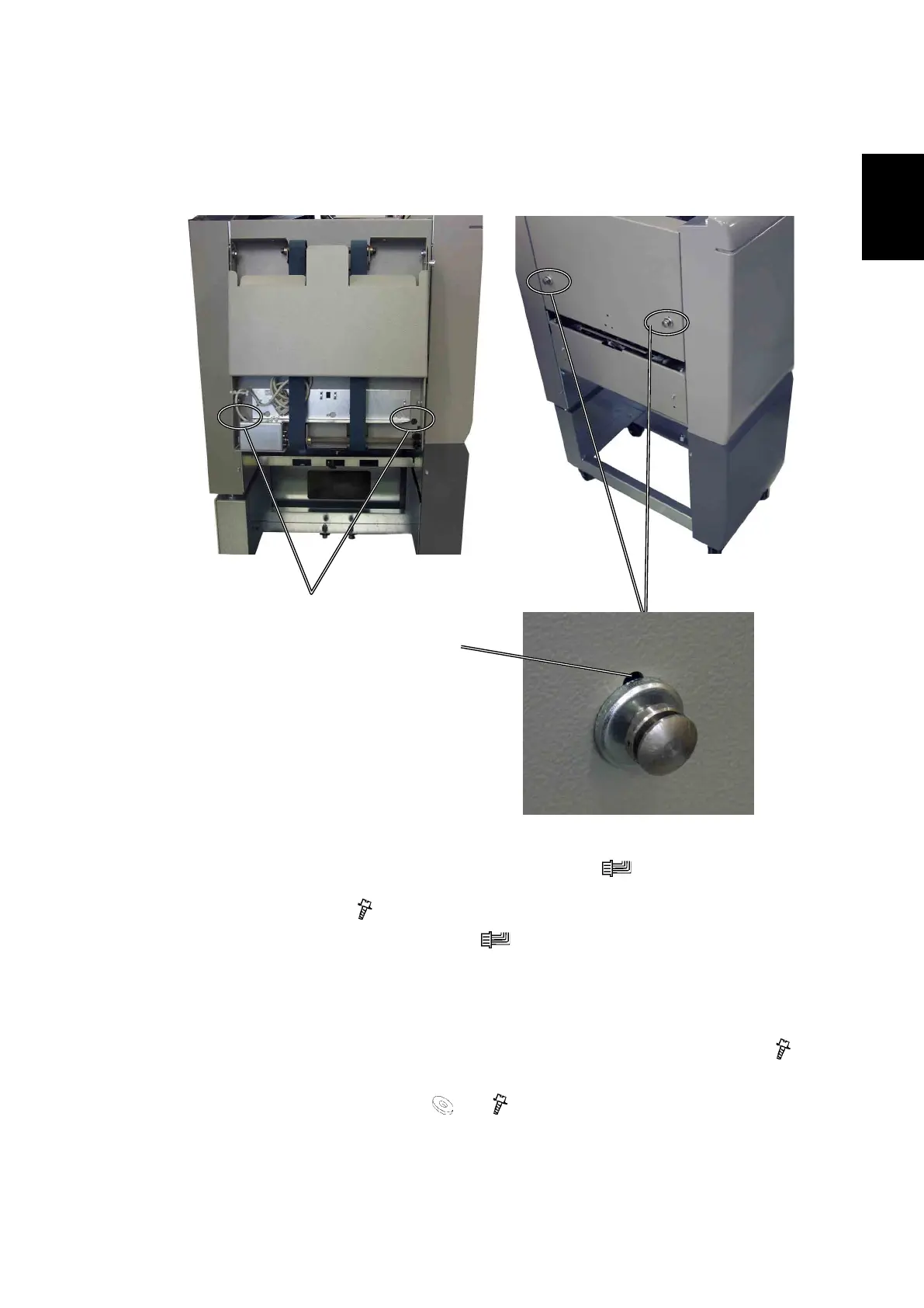 6. Remove the positioning pins from the upper holes [B], used for the belt stacker ( x 2).
