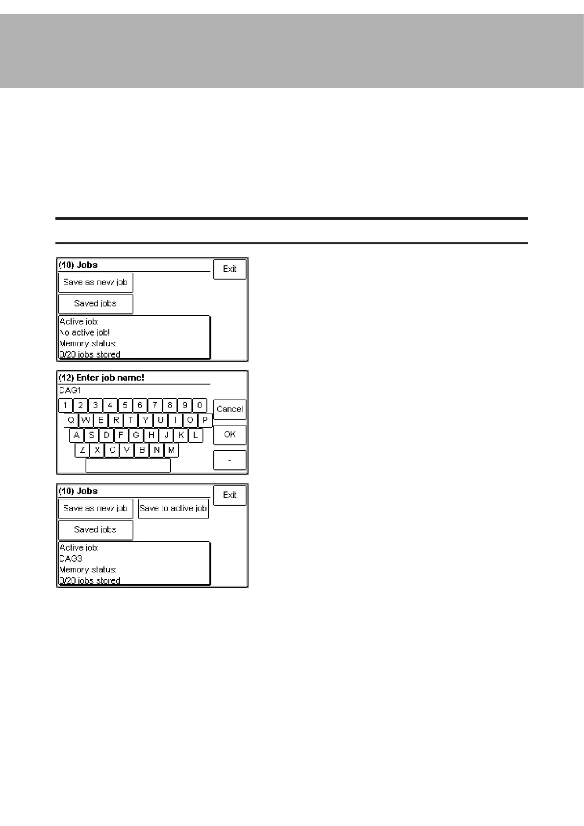 From the Ready screen, press the [Jobs] button to be able to store, change or delete jobs.