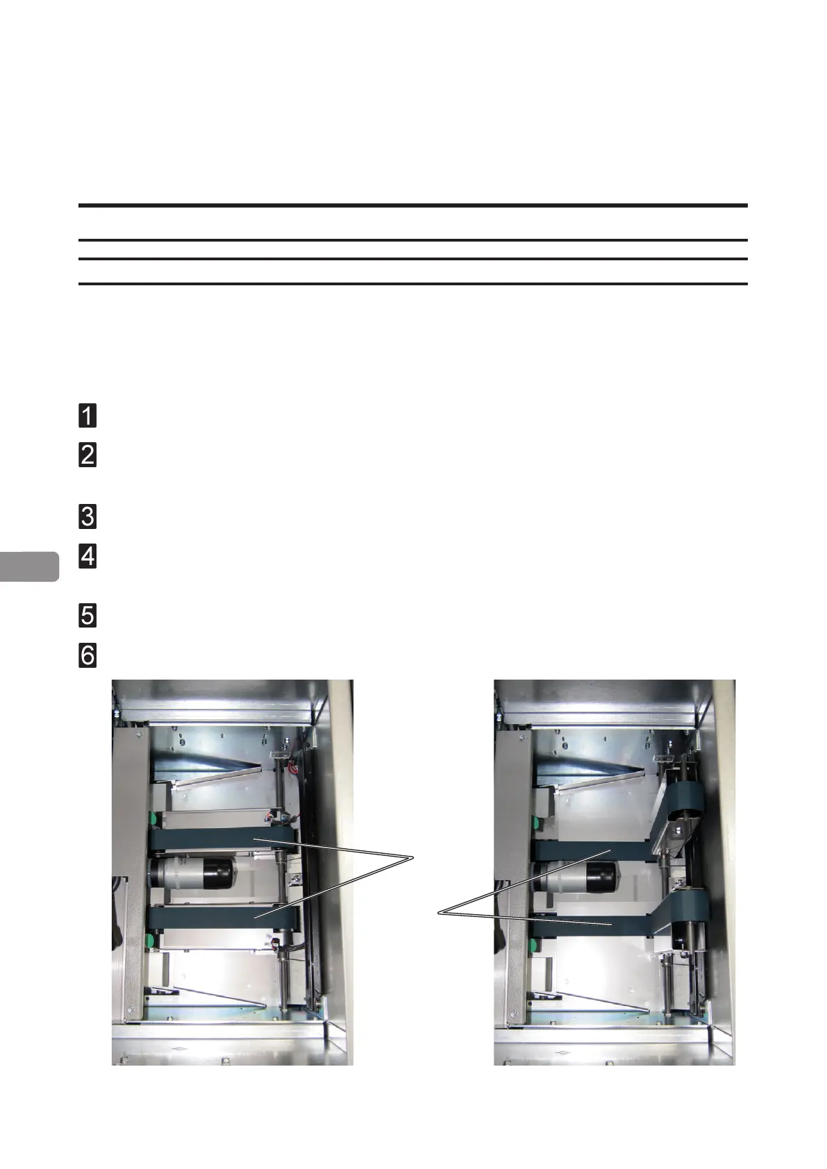 Clean the lower feed belts (B). Rotate the lower feed belts towards the outfeed side for