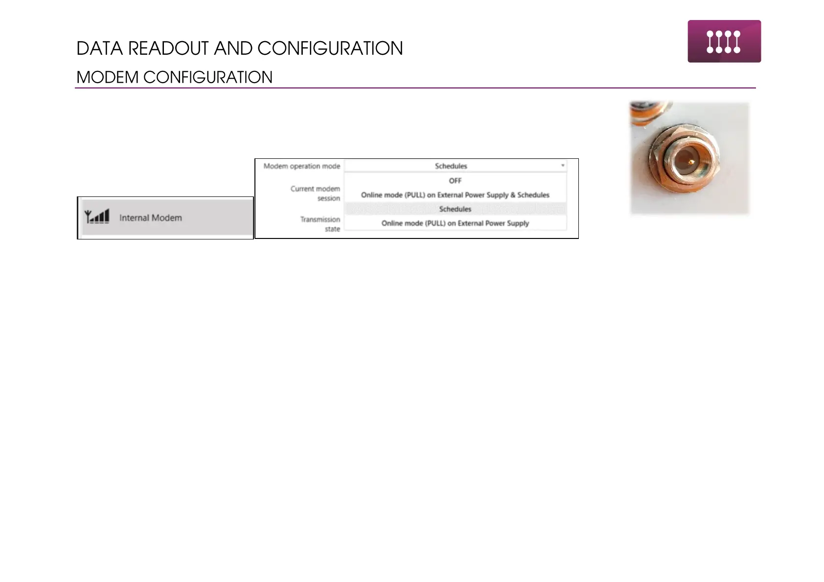 • Schedules – modem default state is offline. Modem starts transmission at configured date and time executing actions such